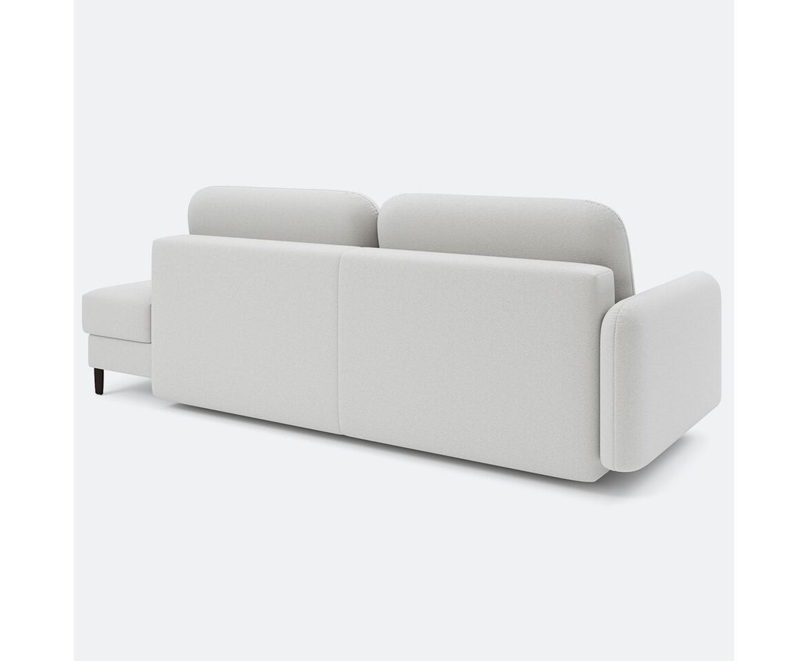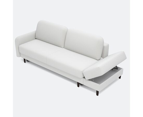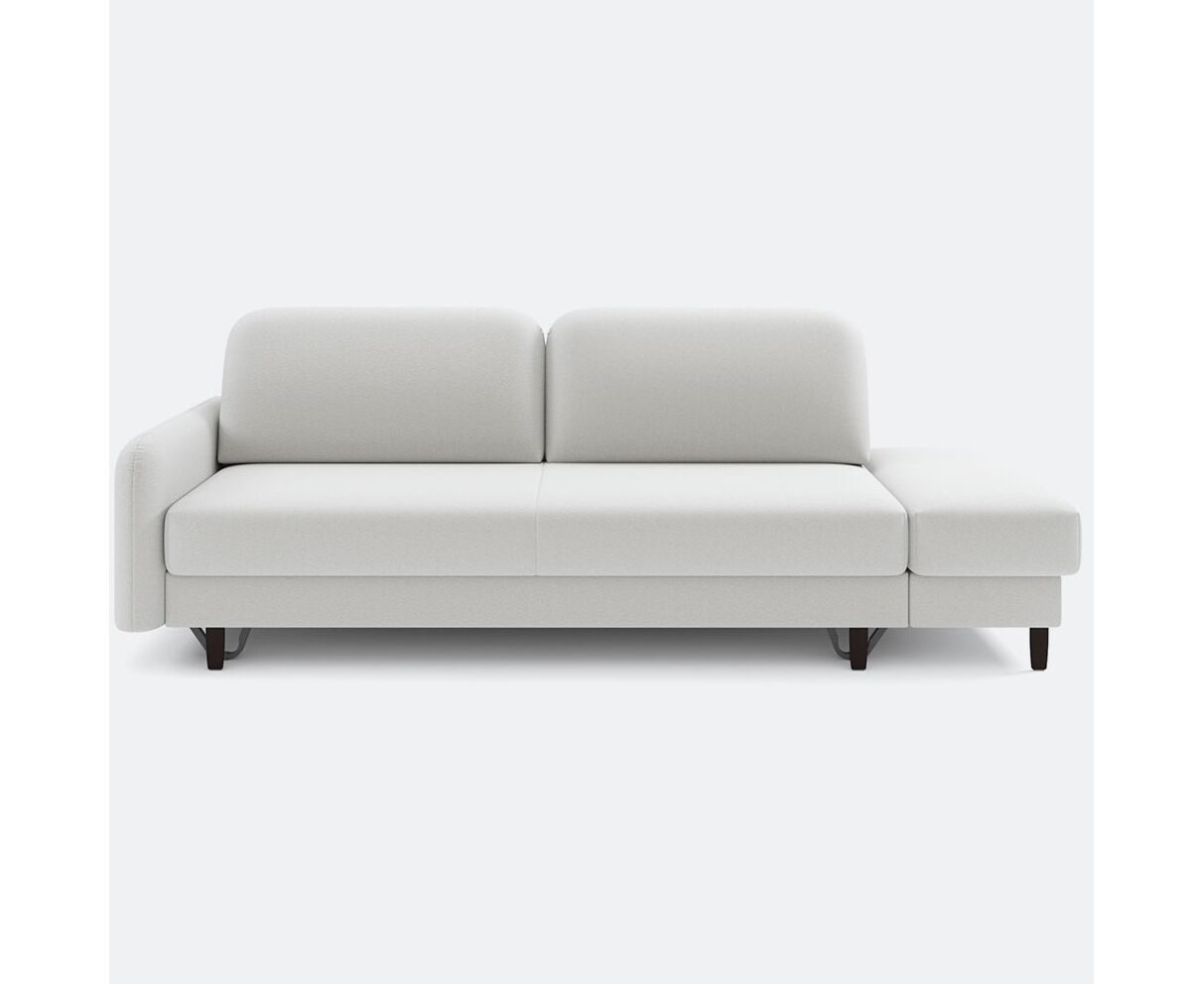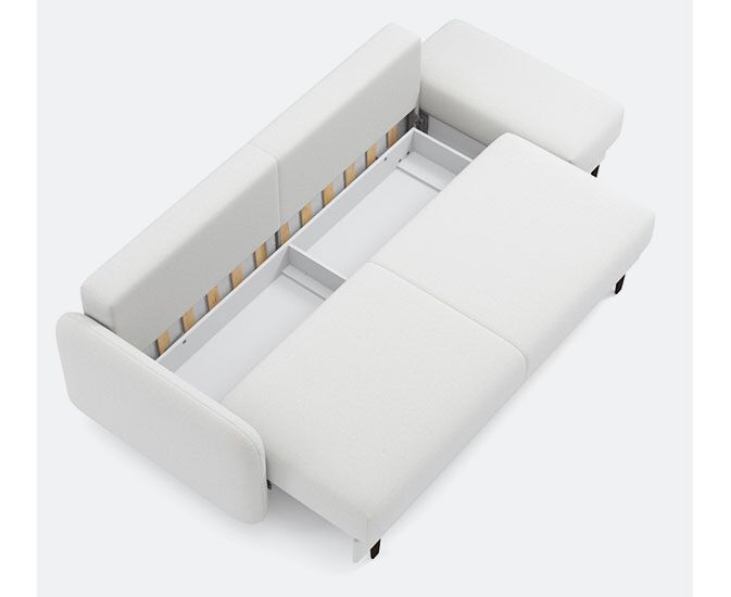 Три конфигурации: 1. еврокнижка (с 2-мя подлокотниками), 2. еврокнижка и пуф с отсеком для хранения, 3. еврокнижка с двумя пуфами. Максимум вариативности. Пуфы — это и дополнительные сиденья для гостей, и два просторных ящика для хранения, и подголовники для отдыха.