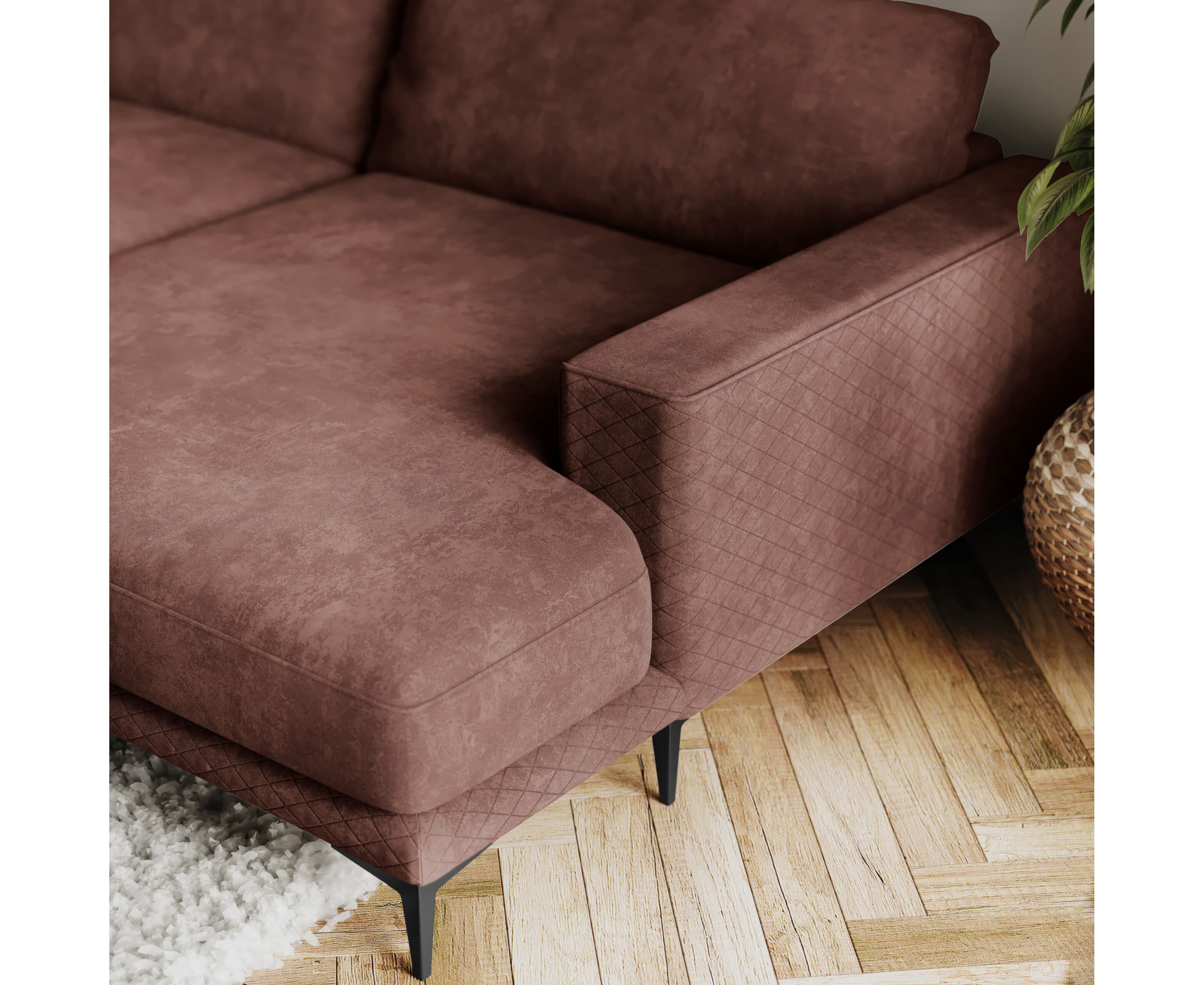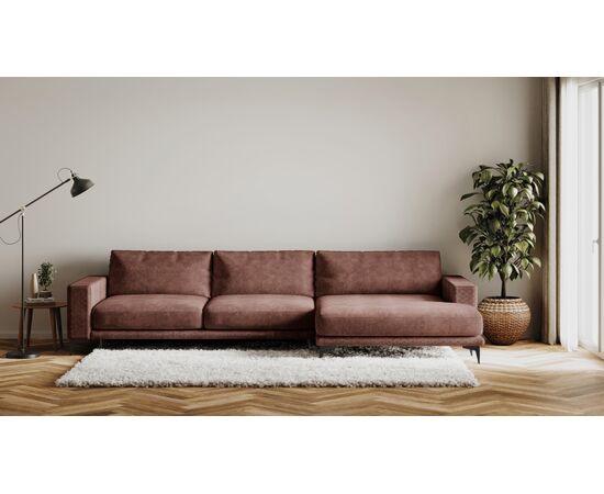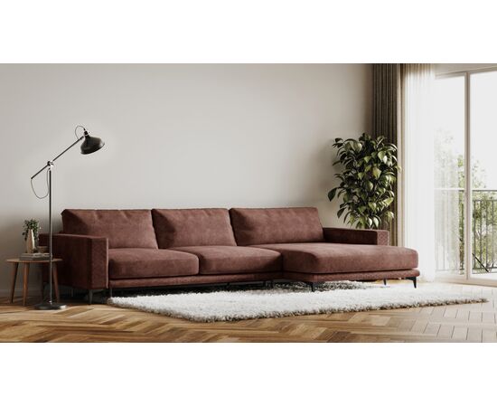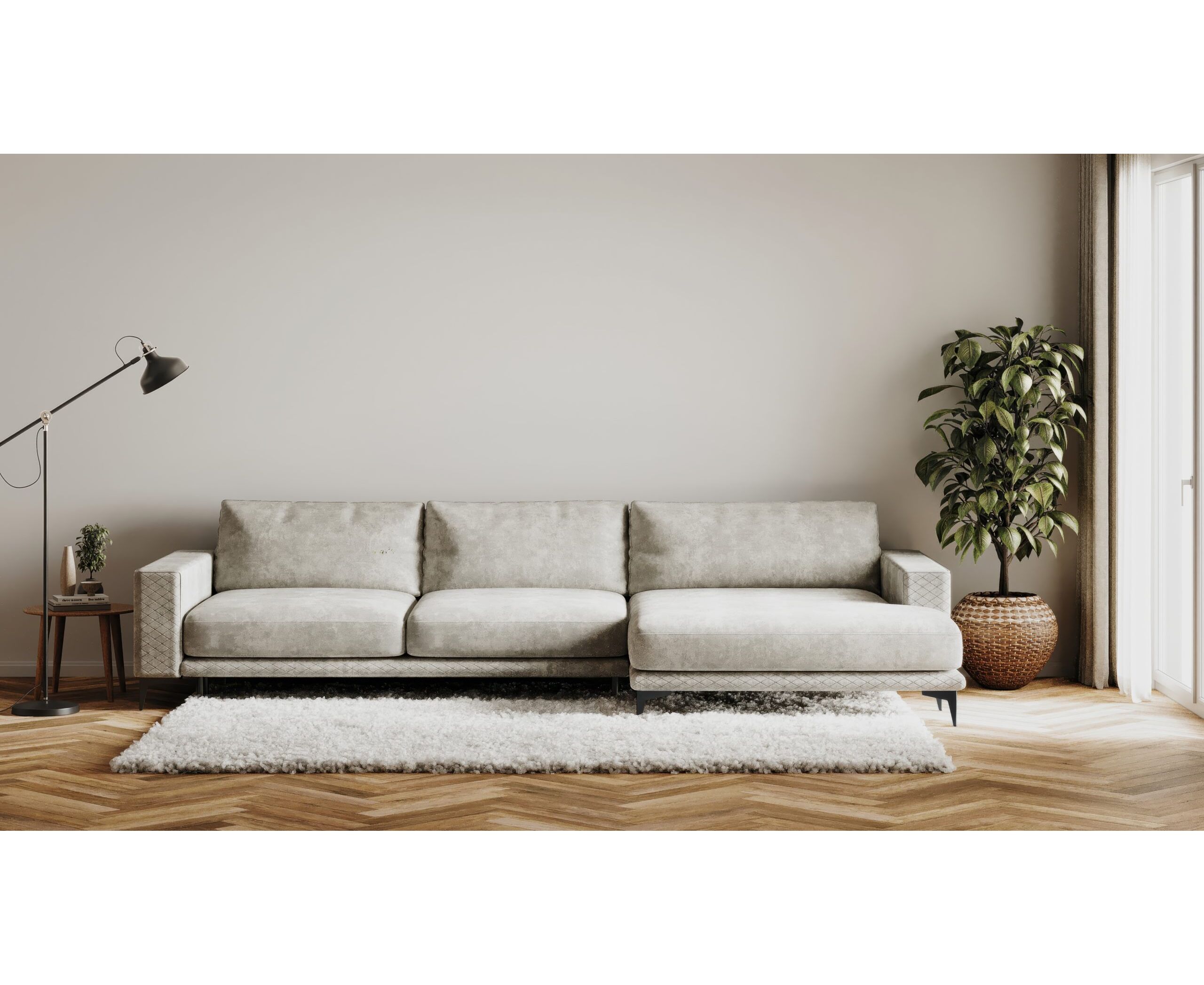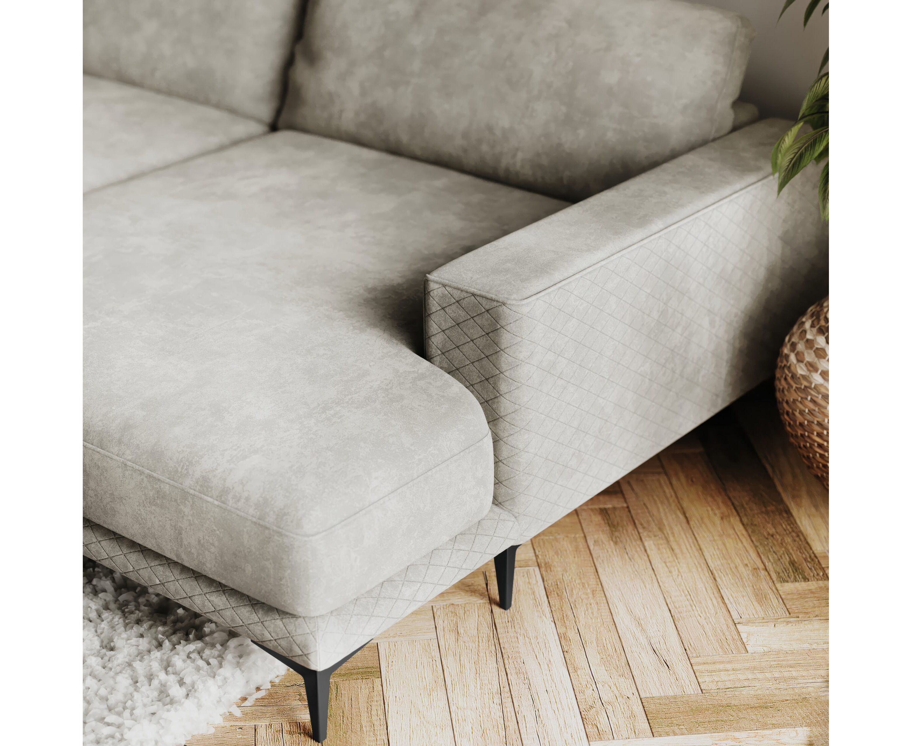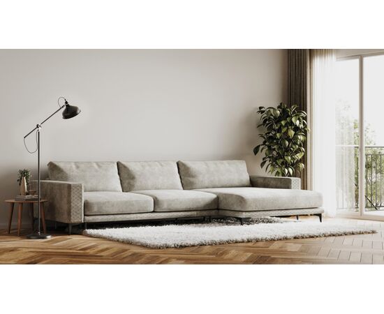 Диван Санторини угловой имеет низкий силуэт и высокие тонкие опоры, придающие дивану стройность.