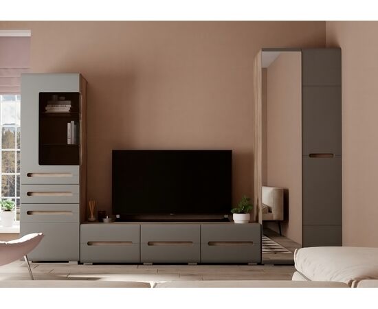 Модульная коллекция «Наоми» – это стильное современное решение в контрастном сочетании корпуса «дуб каньон» с элегантным матовым фасадом насыщенного грифельного оттенка. Оригинальное конструктивное решение коллекции – ручки фасадов, выполненные путем сложной фрезеровки с максимально реалистичным декором дубового спила.