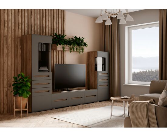 Модульная коллекция «Наоми» – это стильное современное решение в контрастном сочетании корпуса «дуб каньон» с элегантным матовым фасадом насыщенного грифельного оттенка. Оригинальное конструктивное решение коллекции – ручки фасадов, выполненные путем сложной фрезеровки с максимально реалистичным декором дубового спила.