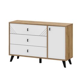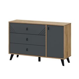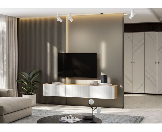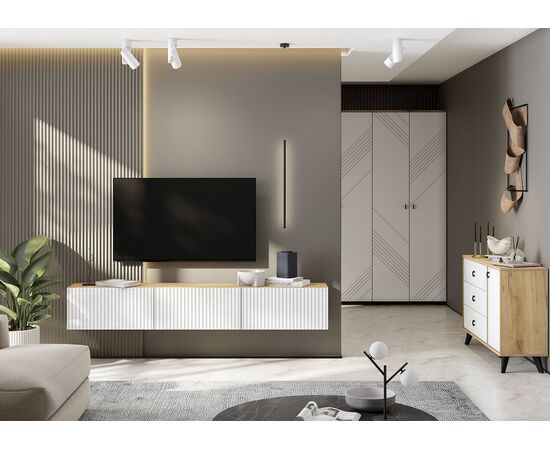 Модульная система "Байкал" - это невероятное сочетание корпуса ЛДСП в цвете "Дуб золотой" и МДФ-фасадов в цветах "Белый матовый" и "Графит".