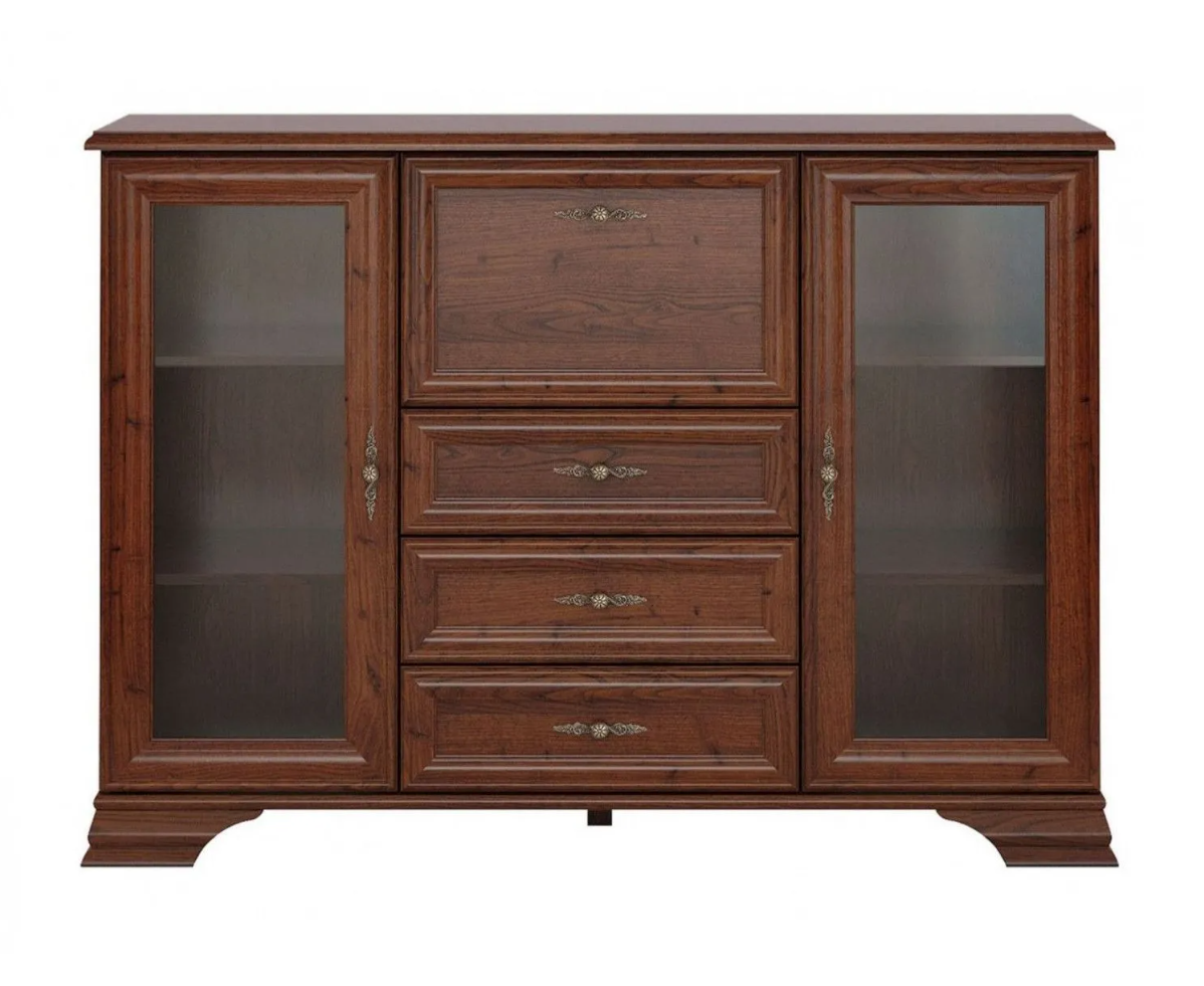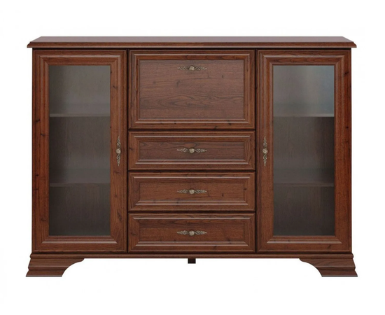 Тумба-бар Кентаки каштан KOM2W3S1B отличается большой вместительностью и гармоничным видом. Это модель с расширенным объемом функций, в которой кроме трех выдвижных ящиков есть одно отделение и две распашные двери с полками внутри. Она легко заменит витрину и позволит хранить за стеклом красивые сервизы и сувениры, а за откидной створкой – организовать настоящий бар с изысканным алкоголем.