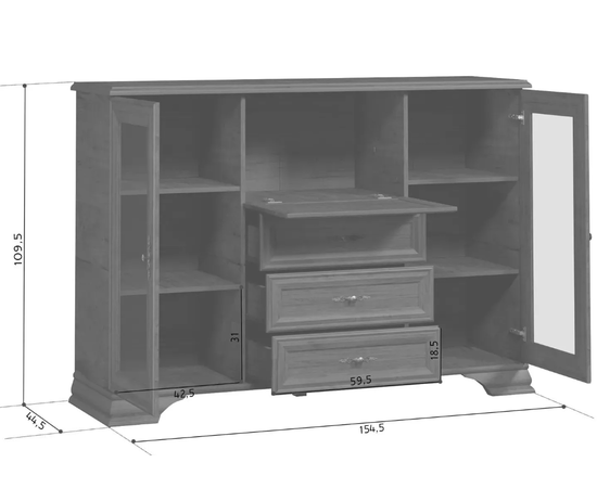 Каштановая высокая тумба на ножках производства Белоруссии имеет правильные линейные размеры. Высота конструкции составляет 109,5 см и ширина ‑ 154,5 см, что позволит установить ее в небольшой комнате. Глубина тумбочки в 44,5 см позволит разместить внутри много полезных вещей. Для увеличения срока ее службы производитель BRW использовал европейскую фурнитуру высокого качества. Изящные металлические ручки, роликовые направляющие созданы для удобства и вдохновения.