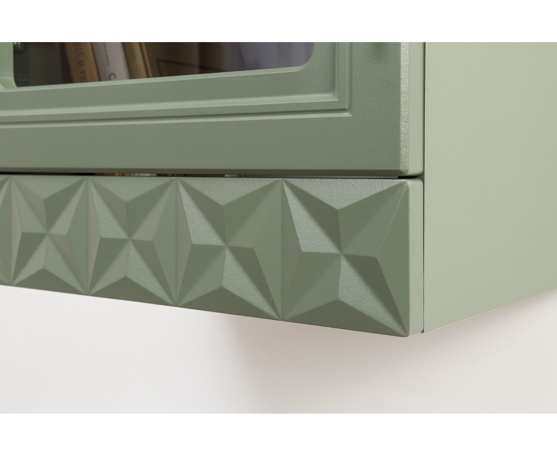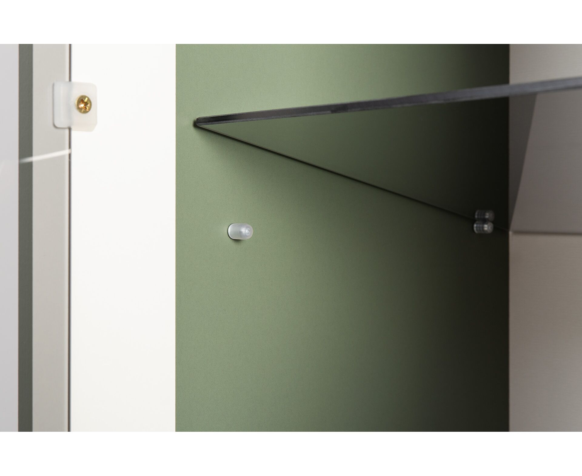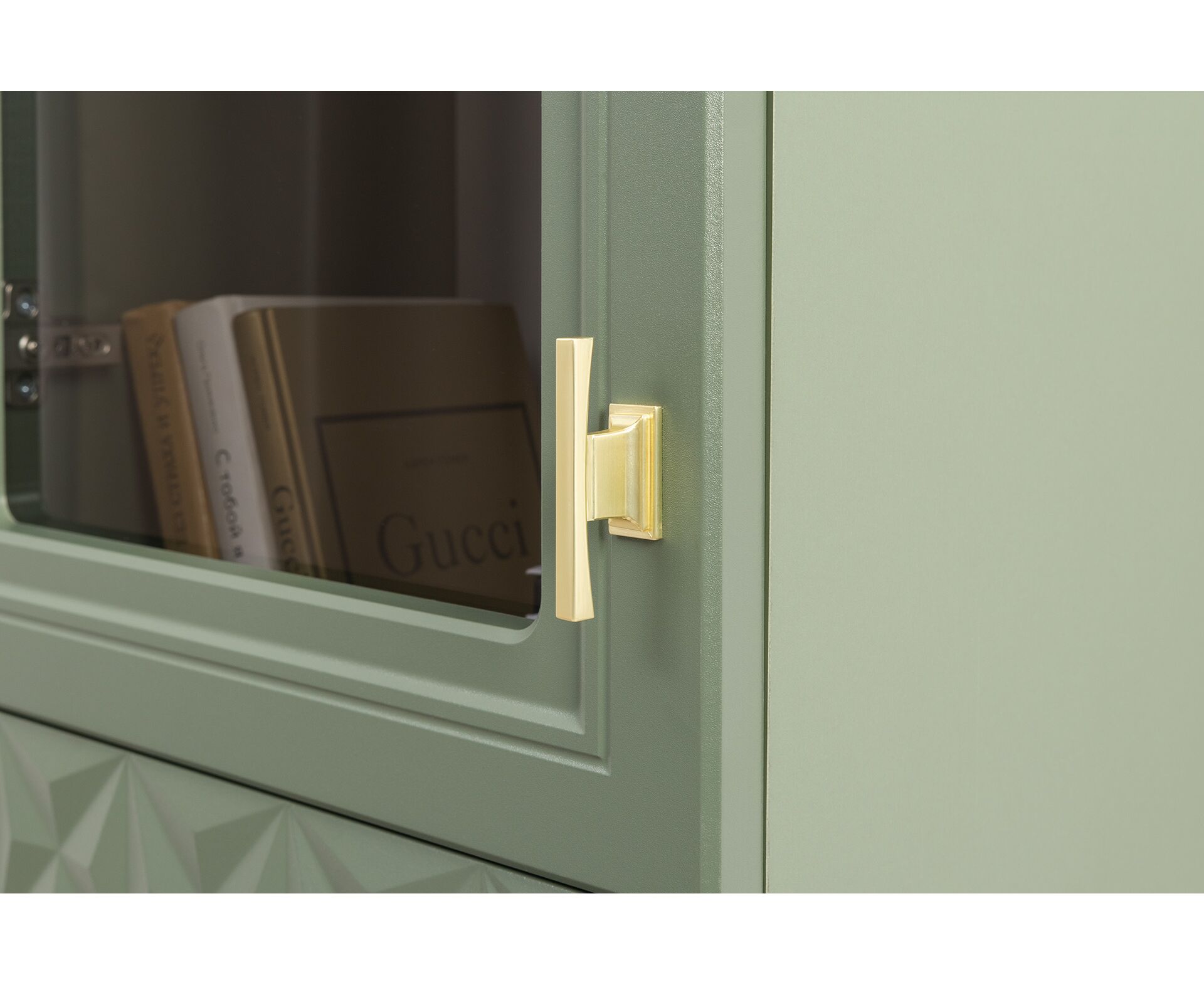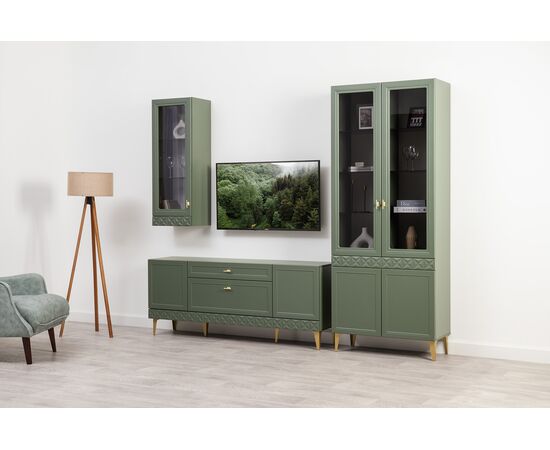 Коллекция создана в двух вариантах цвта: утончённая «Слоновая кость» и изысканная «Олива Шагрень» с глубоким зелёным тоном — создают атмосферу уюта, тепла и благородства. Металлические ручки и опоры золотого цвета придают мебели утончённый блеск, а петли и направляющие с доводчиками обеспечивают плавное и бесшумное закрытие фасадов.