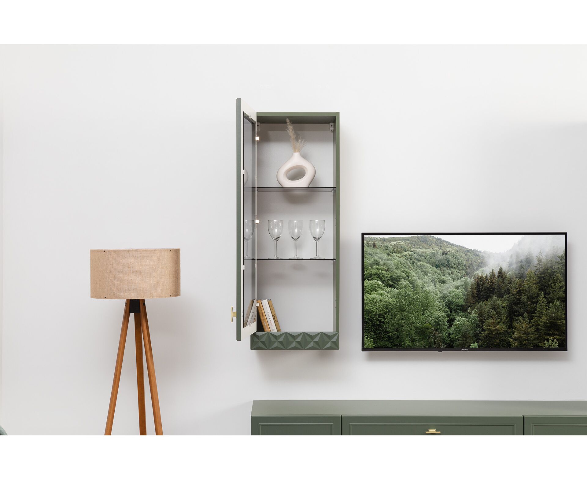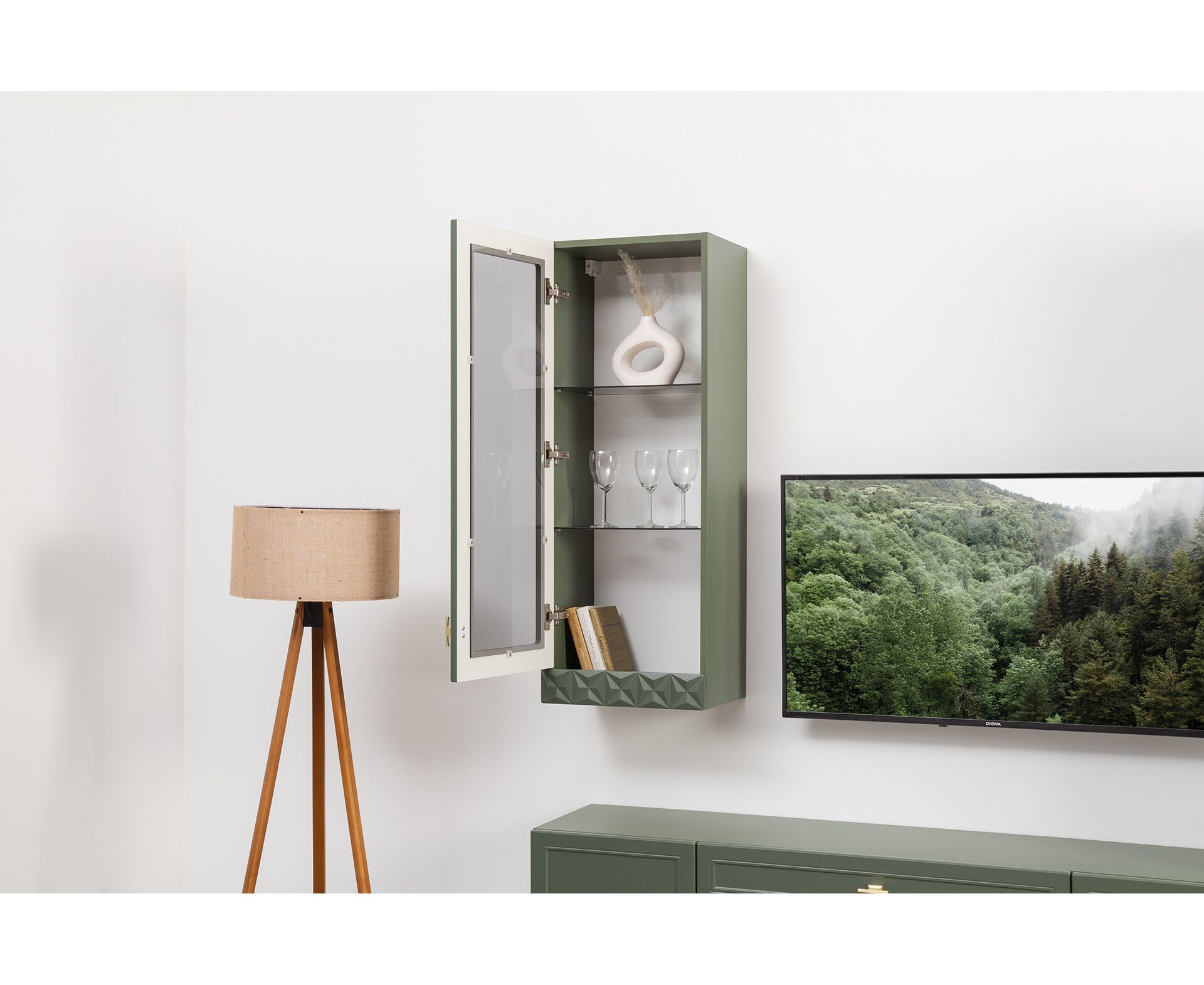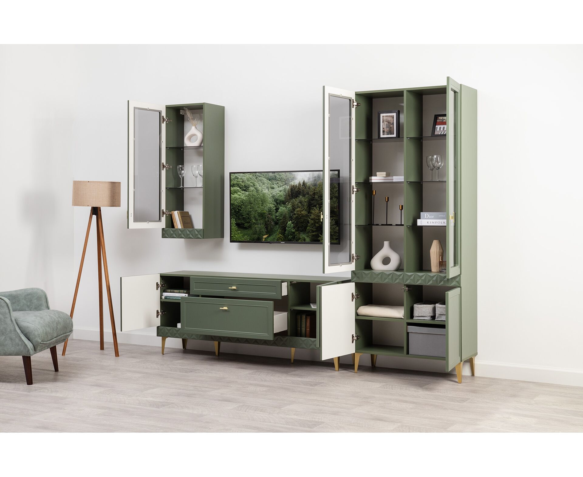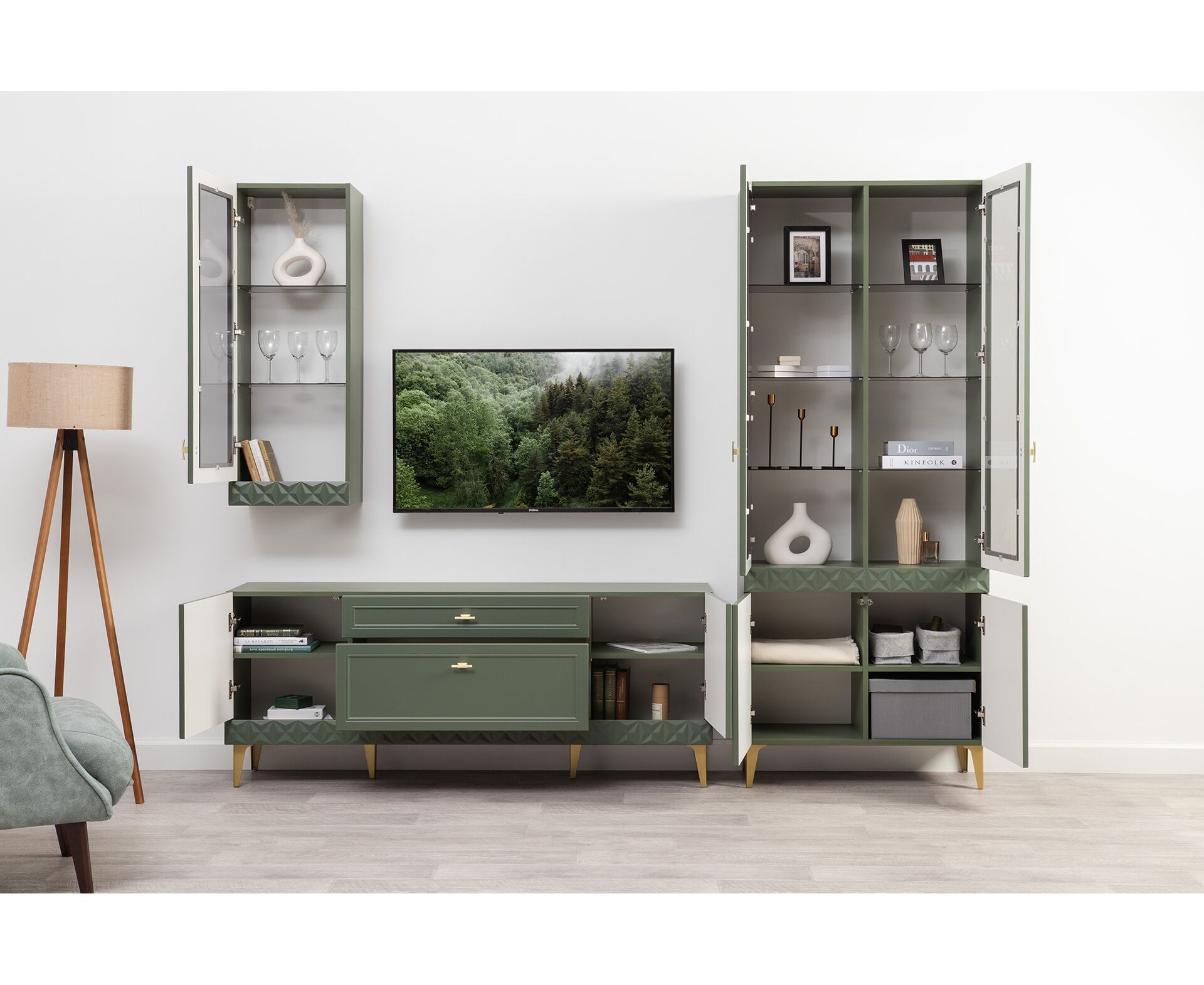 Коллекция создана в двух вариантах цвта: утончённая «Слоновая кость» и изысканная «Олива Шагрень» с глубоким зелёным тоном — создают атмосферу уюта, тепла и благородства. Металлические ручки и опоры золотого цвета придают мебели утончённый блеск, а петли и направляющие с доводчиками обеспечивают плавное и бесшумное закрытие фасадов.