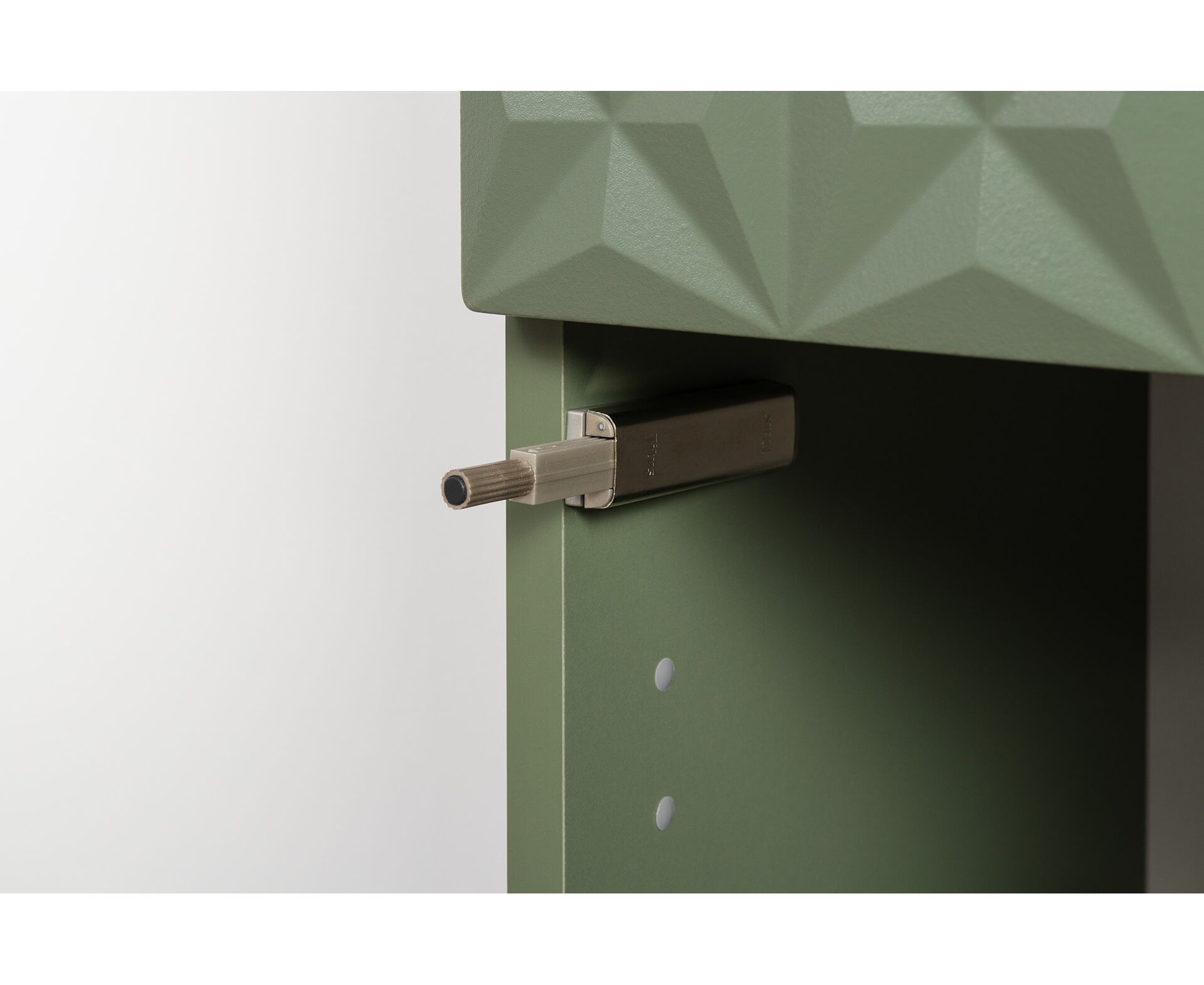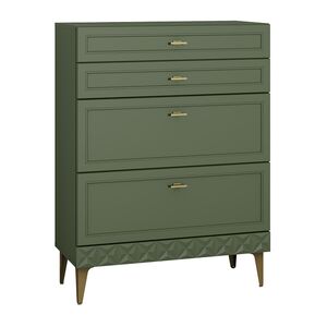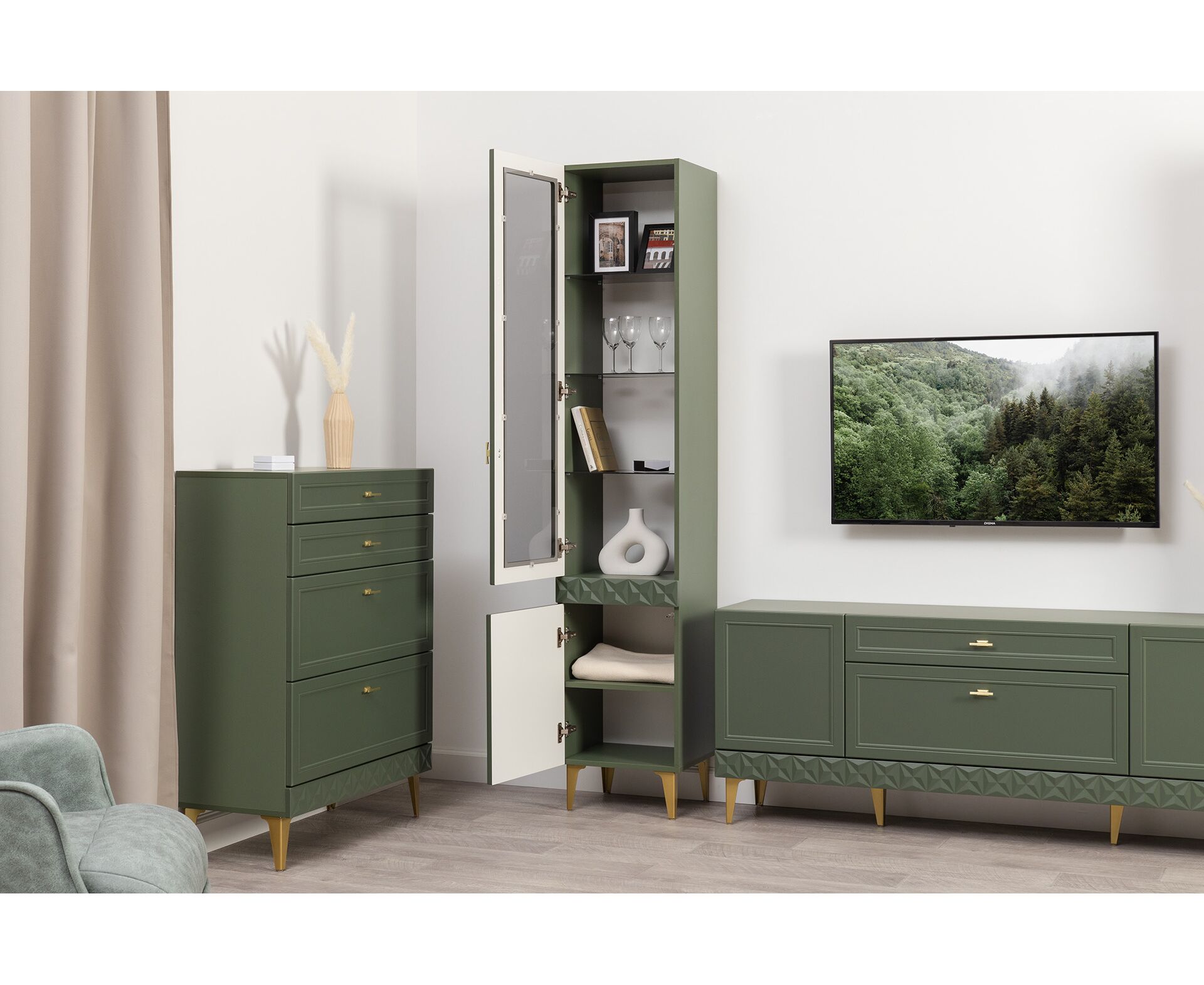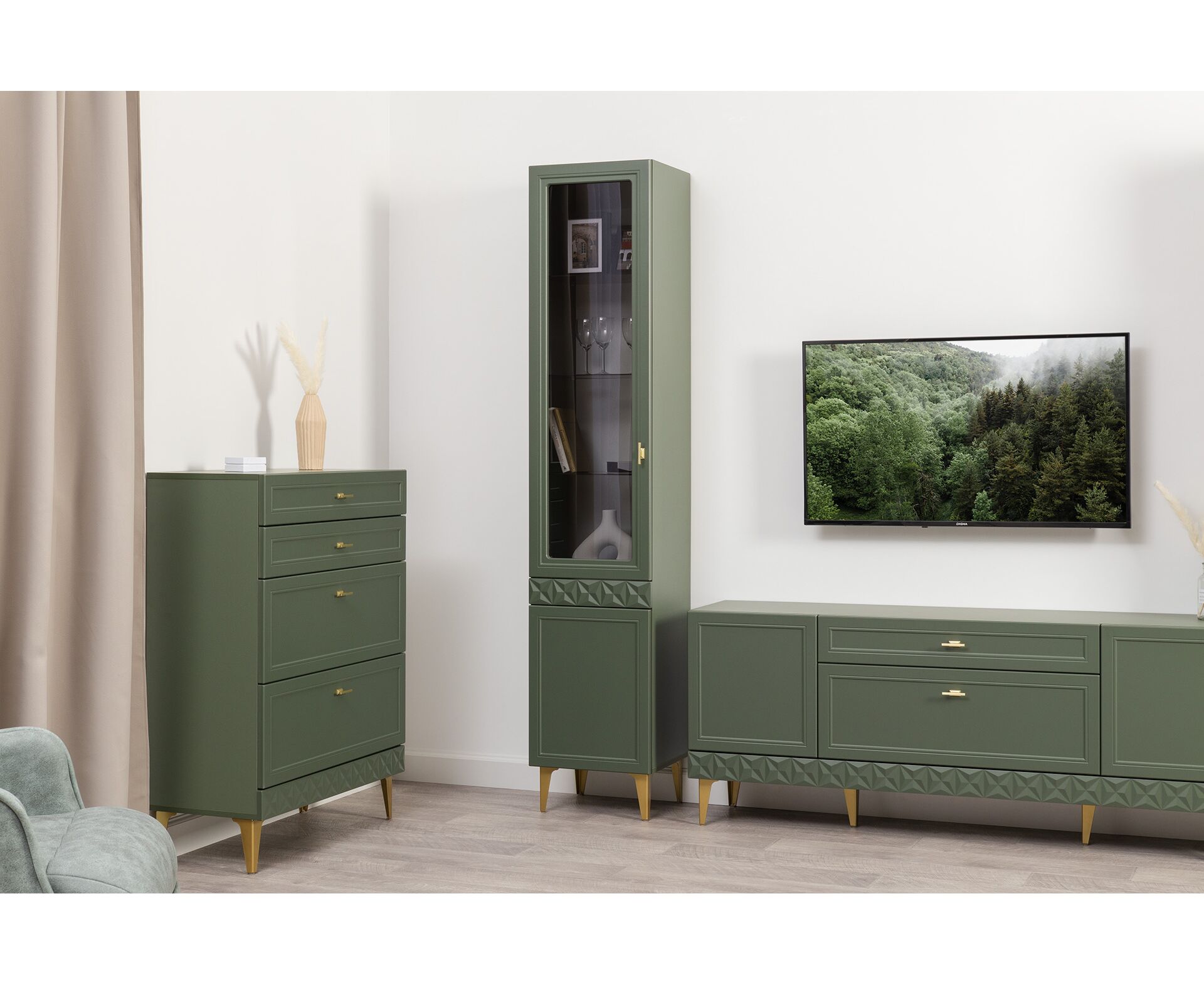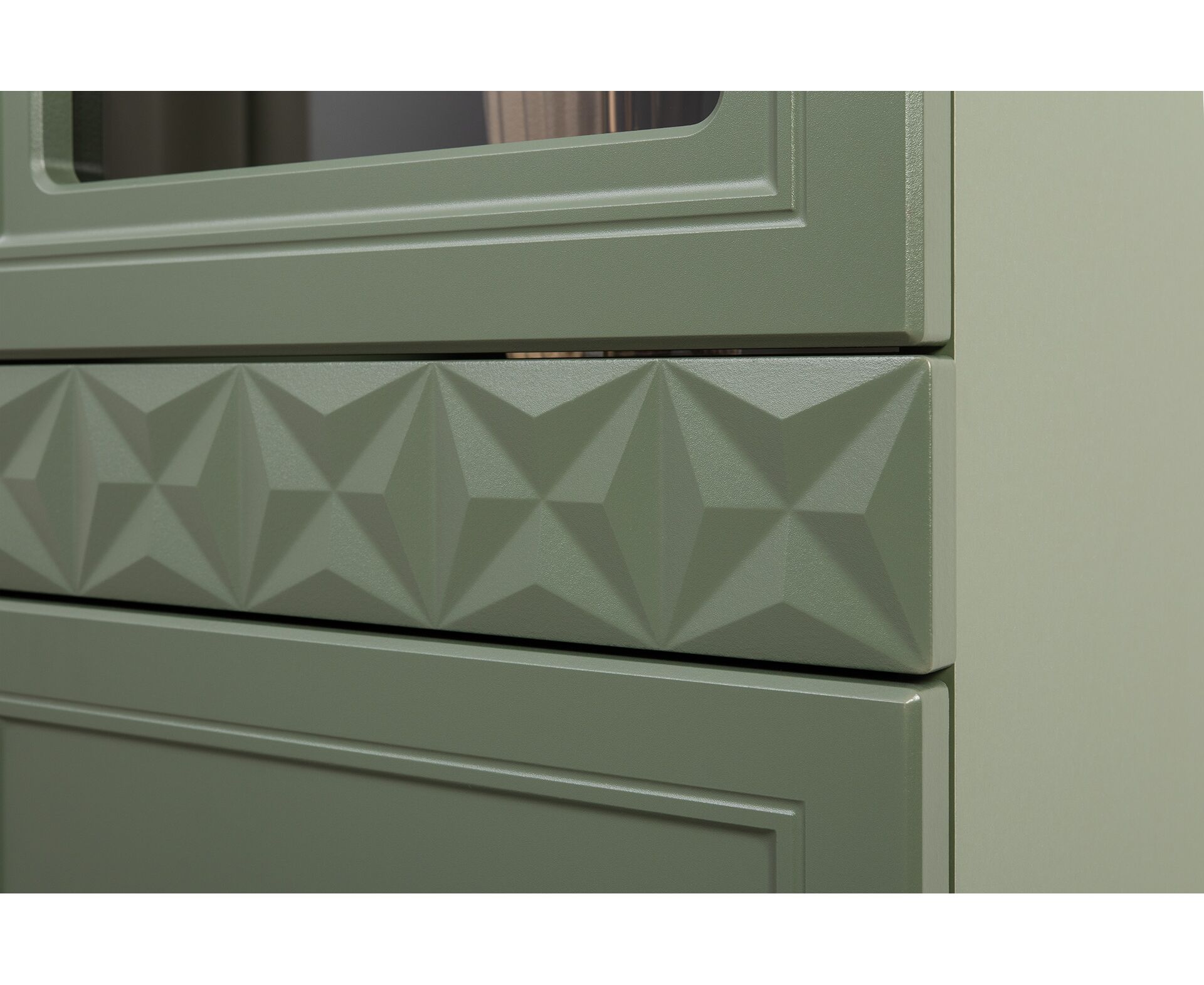 Коллекция создана в двух вариантах цвта: утончённая «Слоновая кость» и изысканная «Олива Шагрень» с глубоким зелёным тоном — создают атмосферу уюта, тепла и благородства. Металлические ручки и опоры золотого цвета придают мебели утончённый блеск, а петли и направляющие с доводчиками обеспечивают плавное и бесшумное закрытие фасадов.