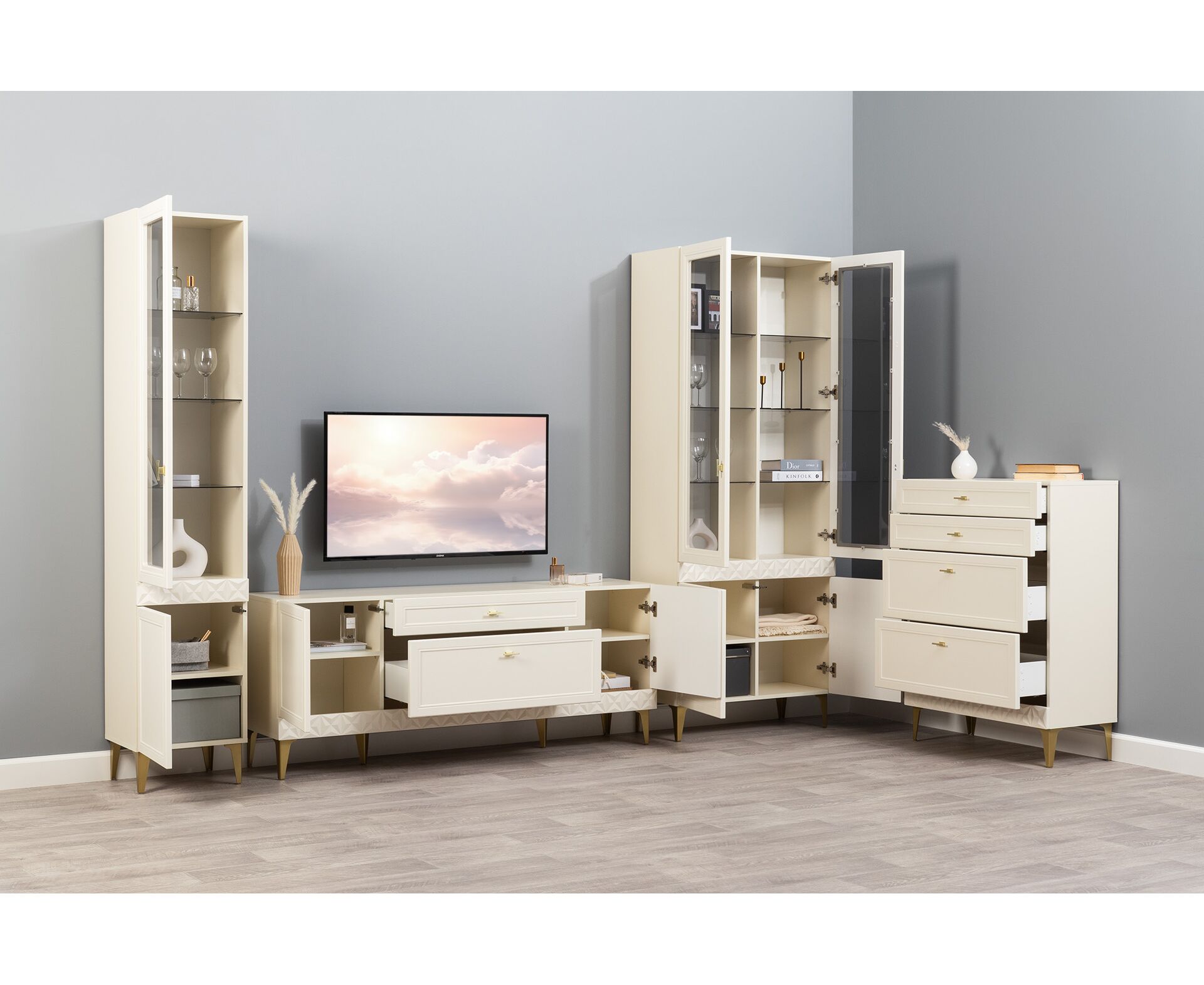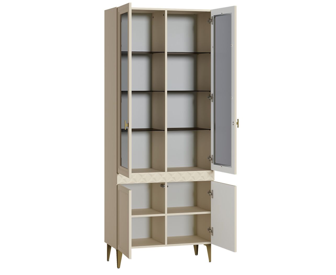 В коллекции представлены три типа витрин с тонированным закалённым стеклом, которые придают пространству лёгкость и свет. «Марион» — идеальное сочетание традиций и актуального дизайна в каждой детали.
