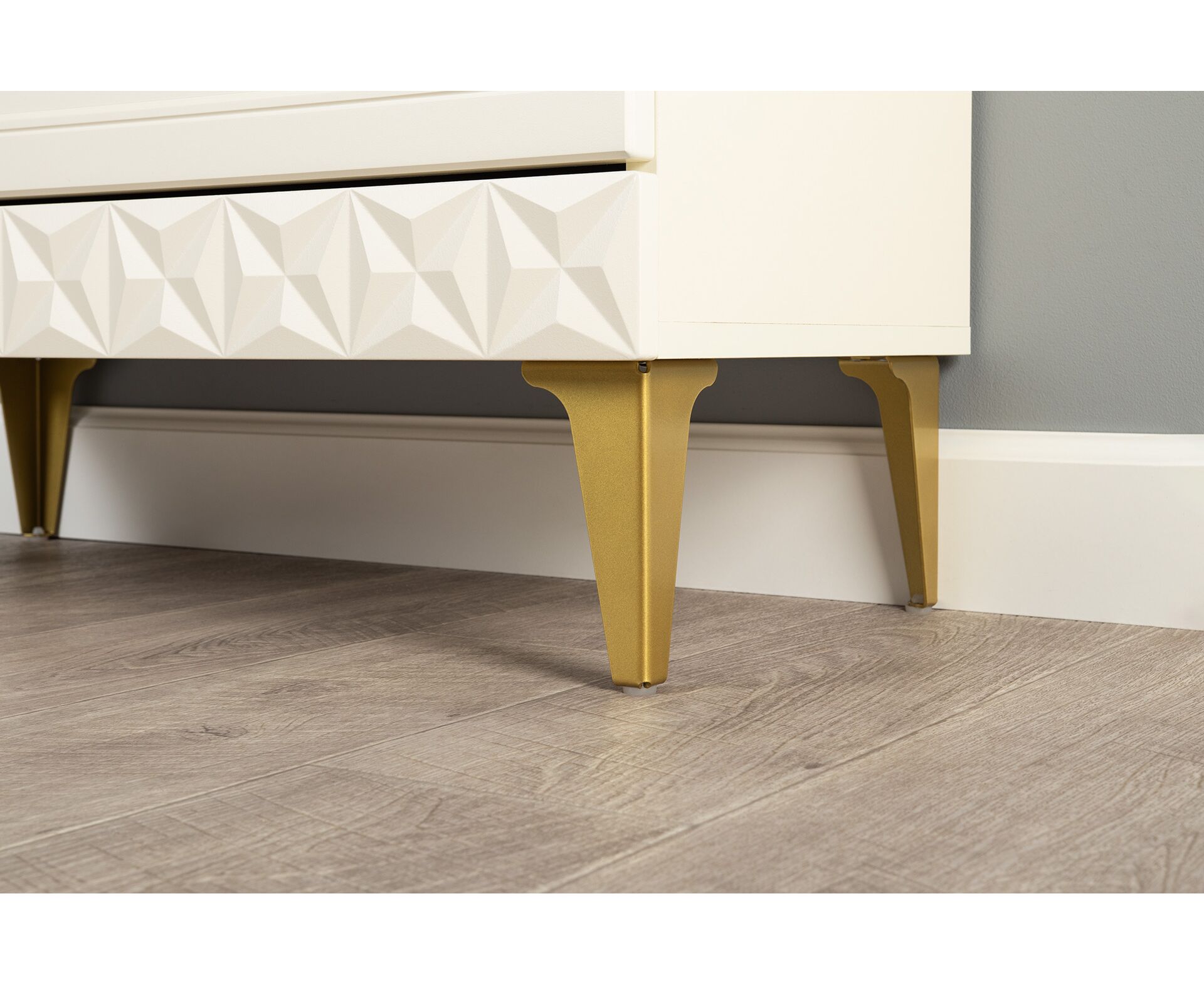 Коллекция создана в двух вариантах цвта: утончённая «Слоновая кость» и изысканная «Олива Шагрень» с глубоким зелёным тоном — создают атмосферу уюта, тепла и благородства. Металлические ручки и опоры золотого цвета придают мебели утончённый блеск, а петли и направляющие с доводчиками обеспечивают плавное и бесшумное закрытие фасадов.