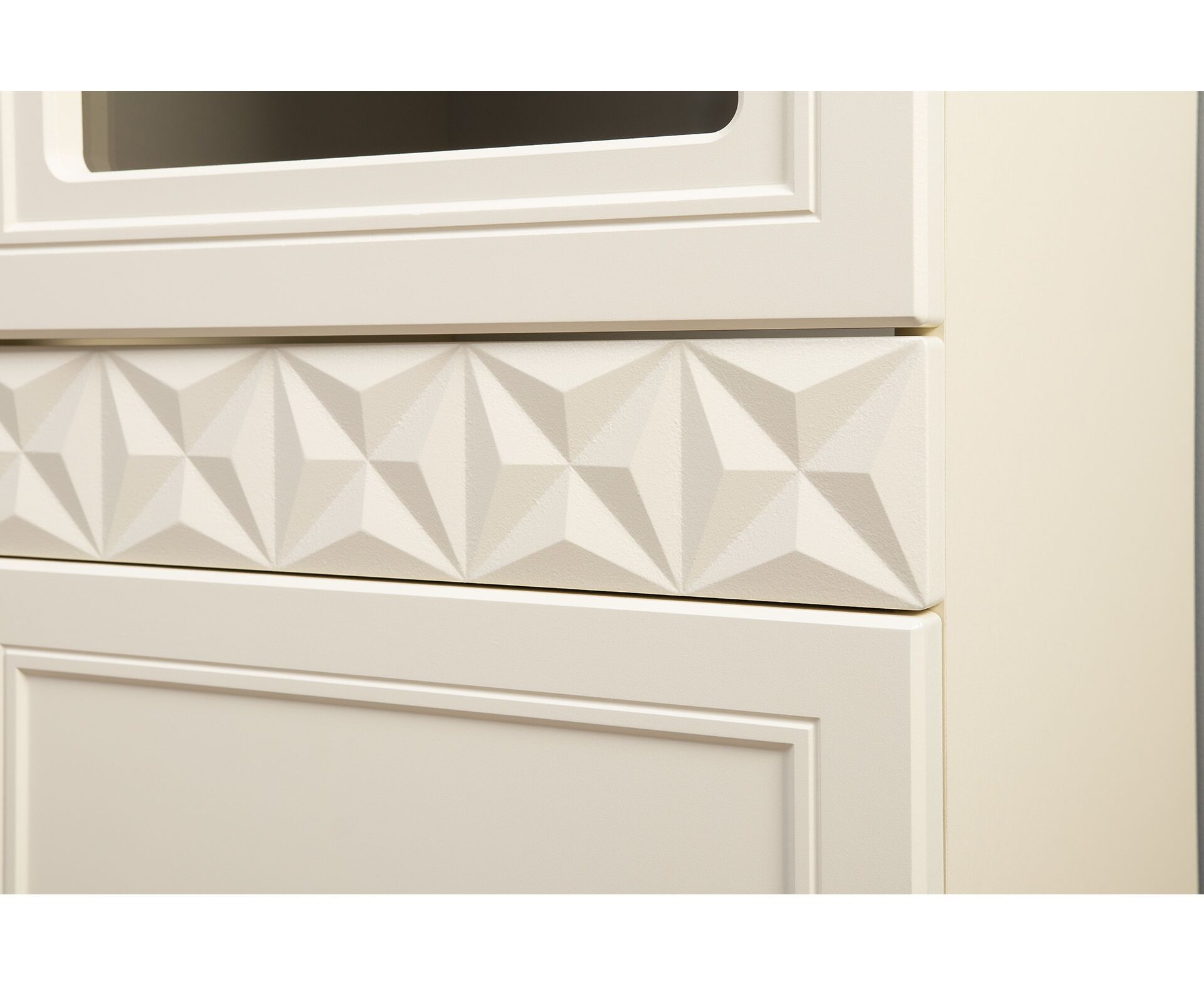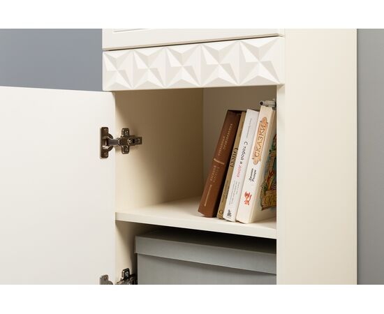 Коллекция создана в двух вариантах цвта: утончённая «Слоновая кость» и изысканная «Олива Шагрень» с глубоким зелёным тоном — создают атмосферу уюта, тепла и благородства. Металлические ручки и опоры золотого цвета придают мебели утончённый блеск, а петли и направляющие с доводчиками обеспечивают плавное и бесшумное закрытие фасадов.