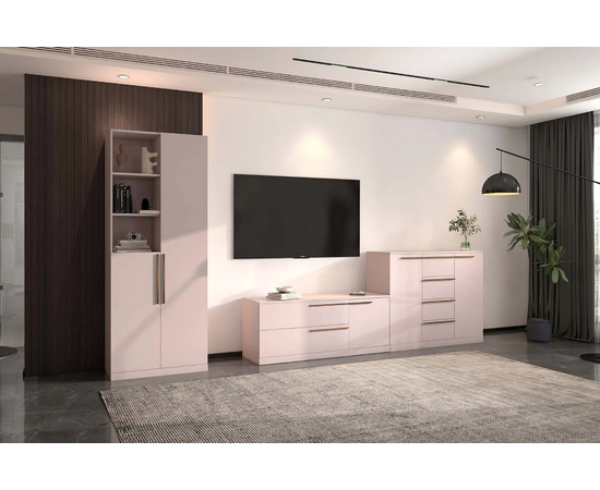 Совершенная новая гостиная Николь в самом трендовом цвете ЛДСП. На выбор представлены два цвета ручек: черный матовый и сатиновое золото.