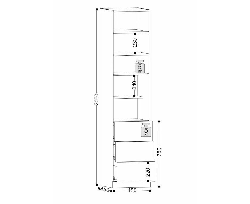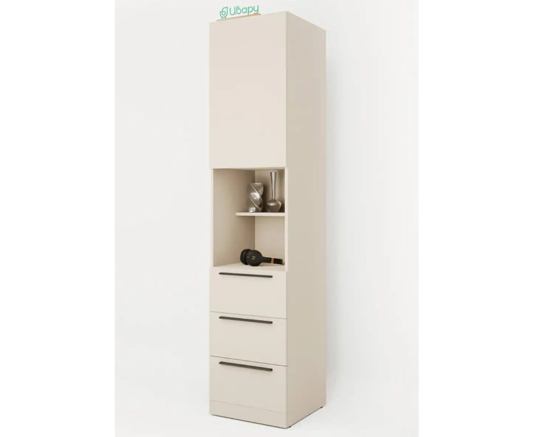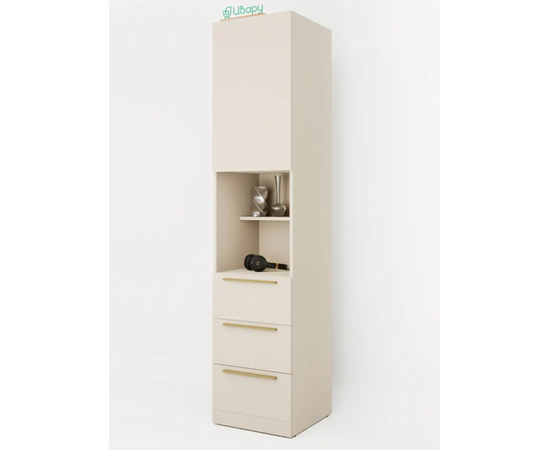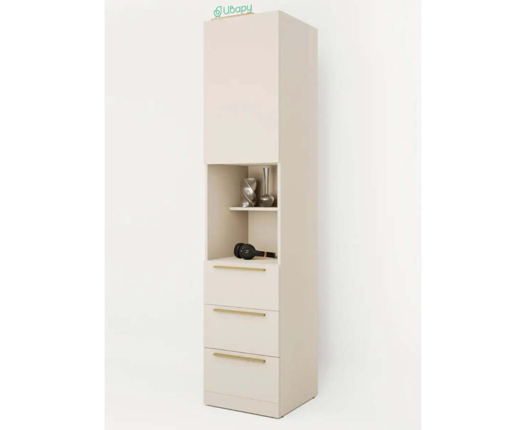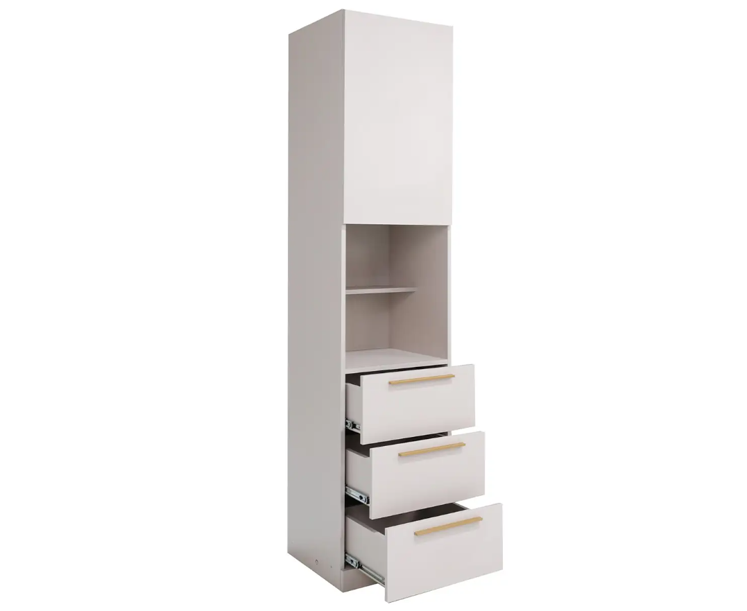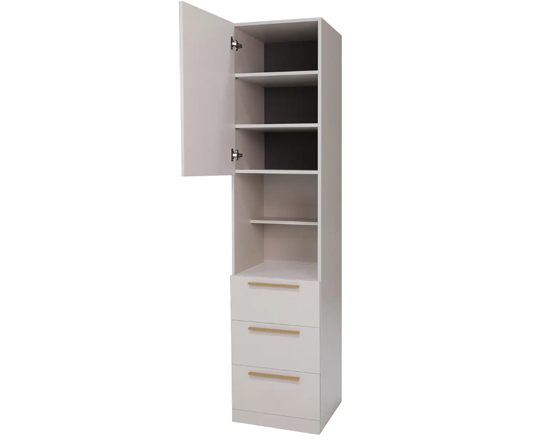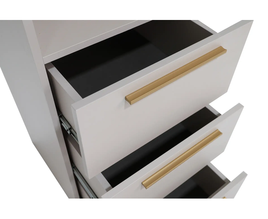 Комбинирование закрытых и открытых ящиков добавят комфорта системе хранения в вашем доме. Качественные направляющие обеспечат плавное закрывание дверей. На выбор представлены два цвета ручек: черный матовый и сатиновое золото.