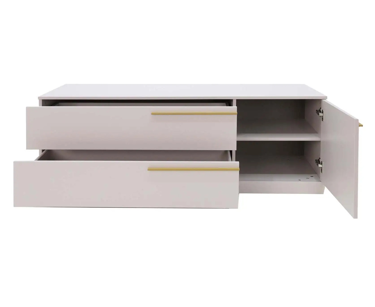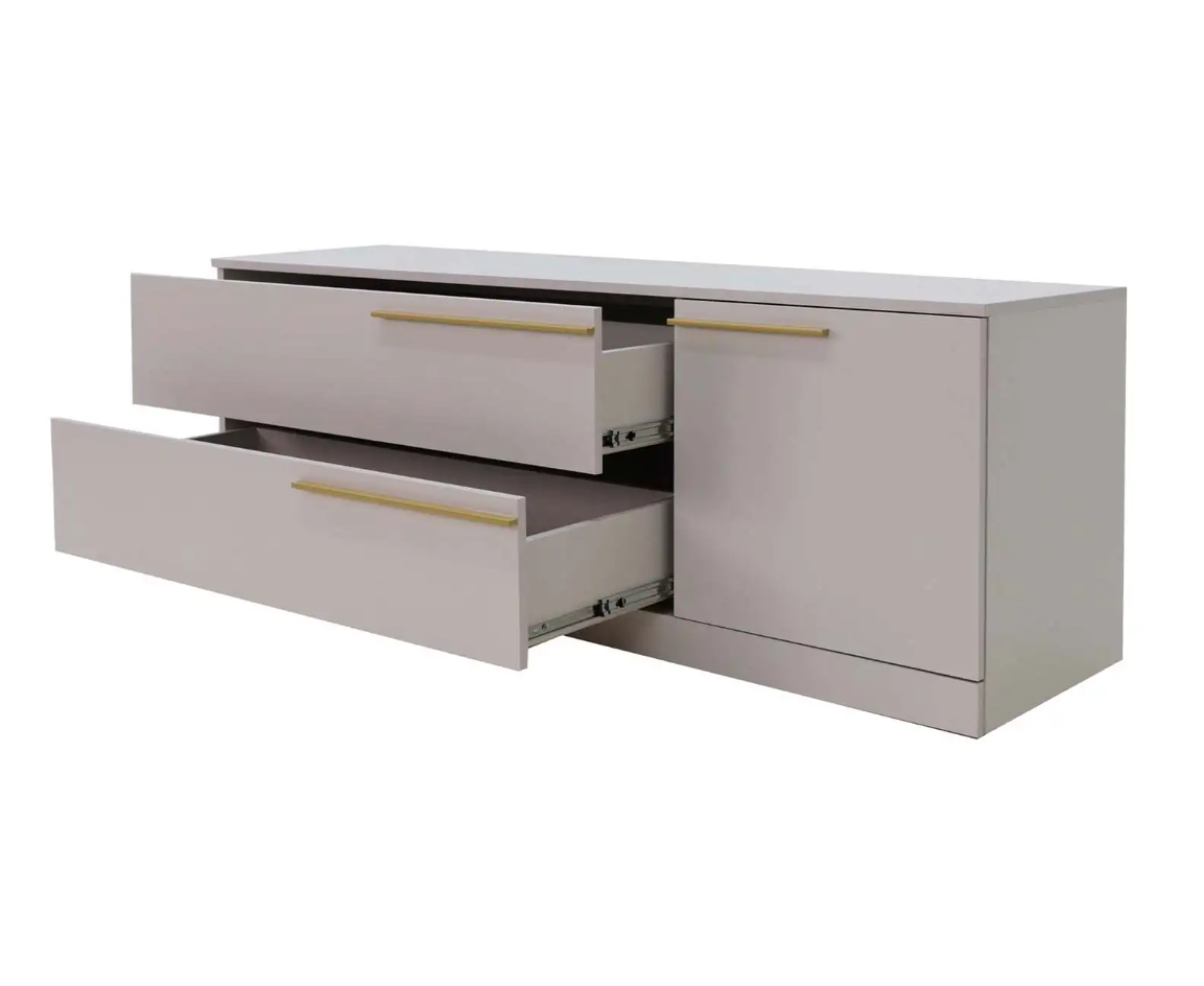 Тумба ТВ Николь-3 прекрасно вписывается в интерьер современной гостиной. Совершенная новая гостиная в самом трендовом цвете ЛДСП. На выбор представлены два цвета ручек: черный матовый и сатиновое золото. Тумба идеально сочетается с одноименной серией.