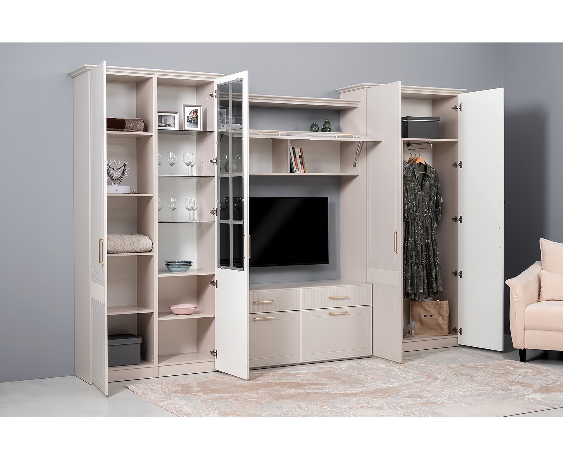 Фрезерованные фасады из МДФ, металлические ручки и витрины с тонированным стеклом создают изысканный образ.