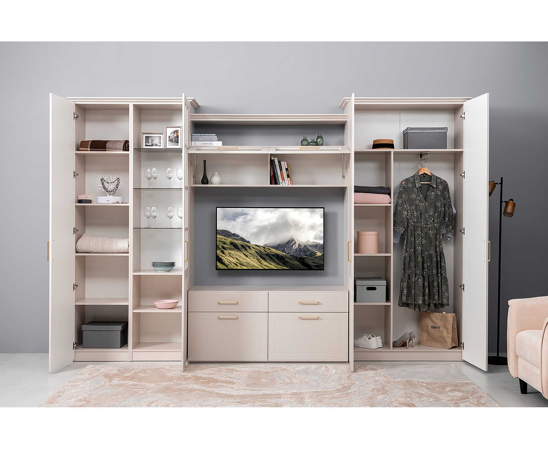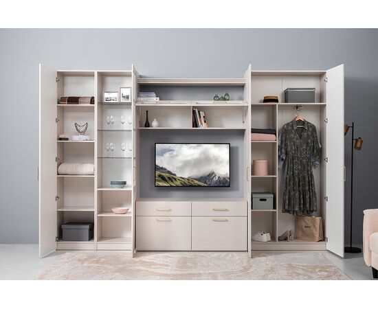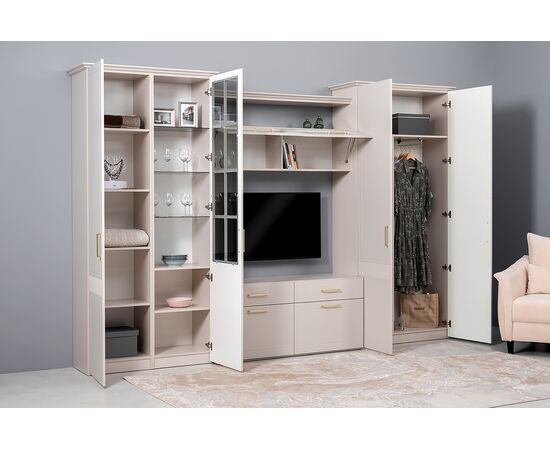 Петли с доводчиками, полное выдвижение ящиков, выдвижная штанга в шкафу для одежды и съемные полки делают использование максимально комфортным.