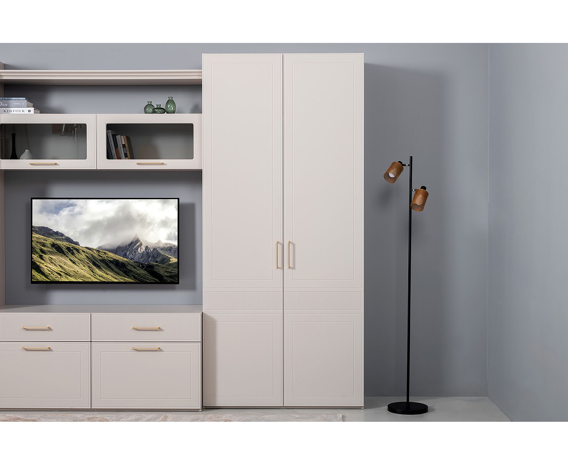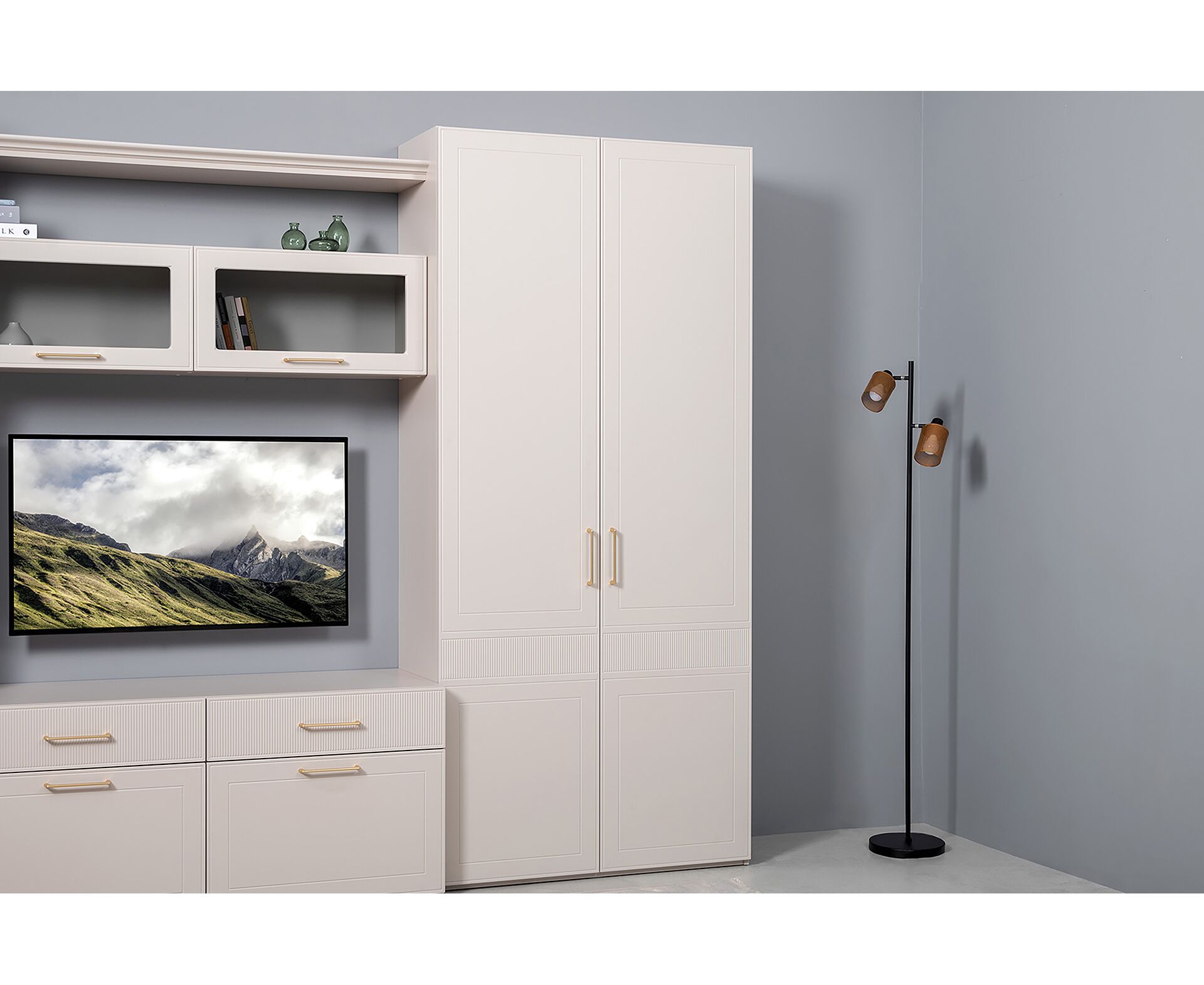 Фрезерованные фасады из МДФ, металлические ручки и витрины с тонированным стеклом создают изысканный образ.