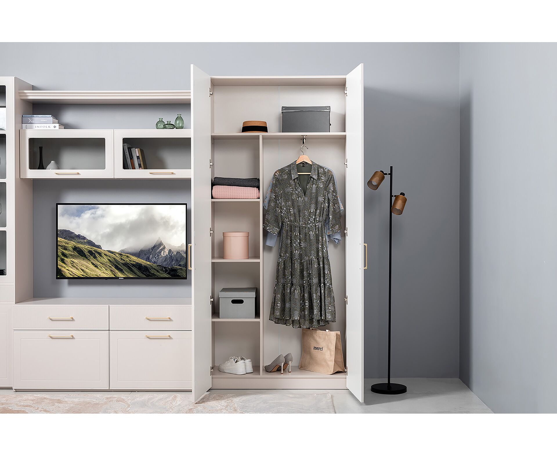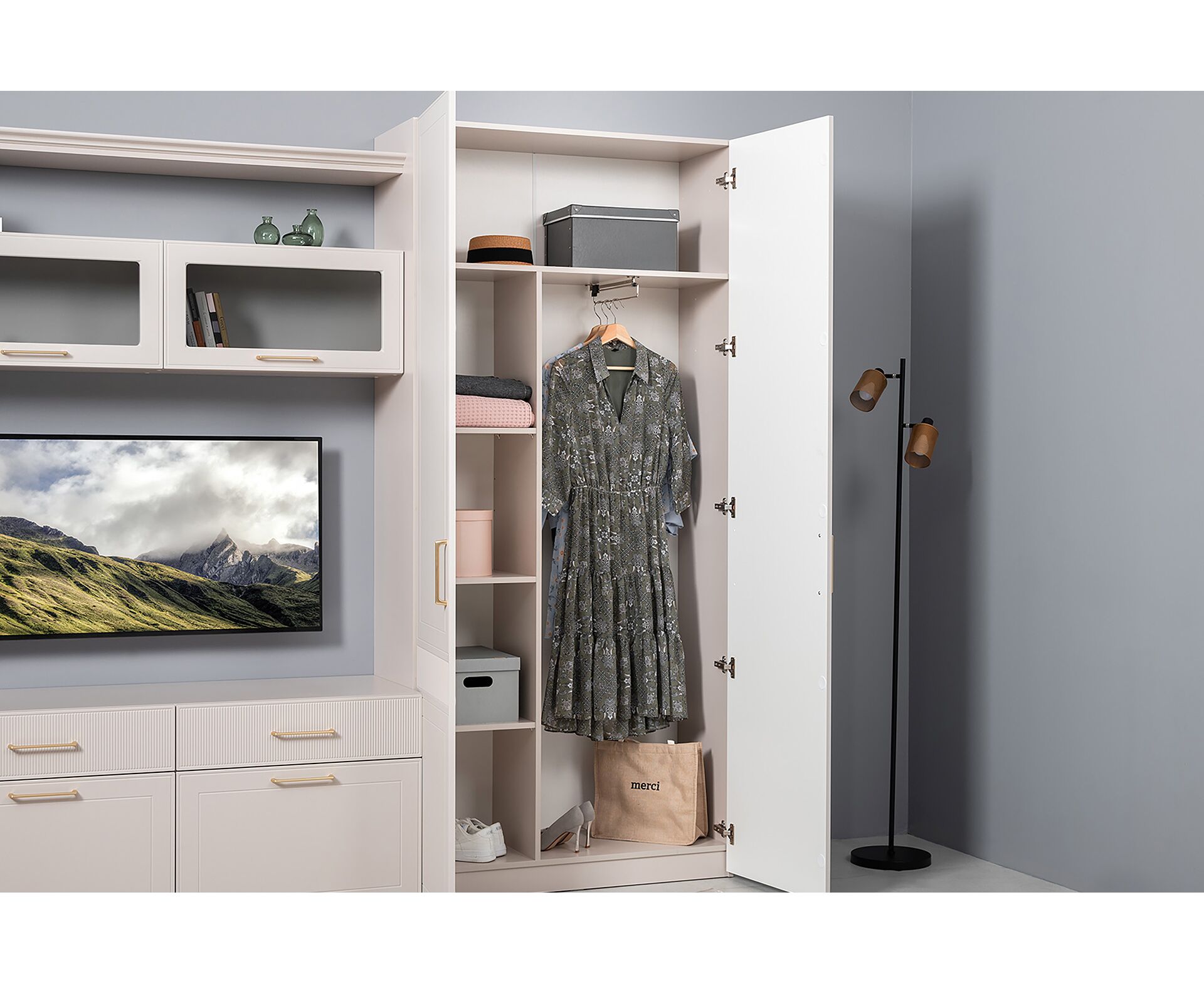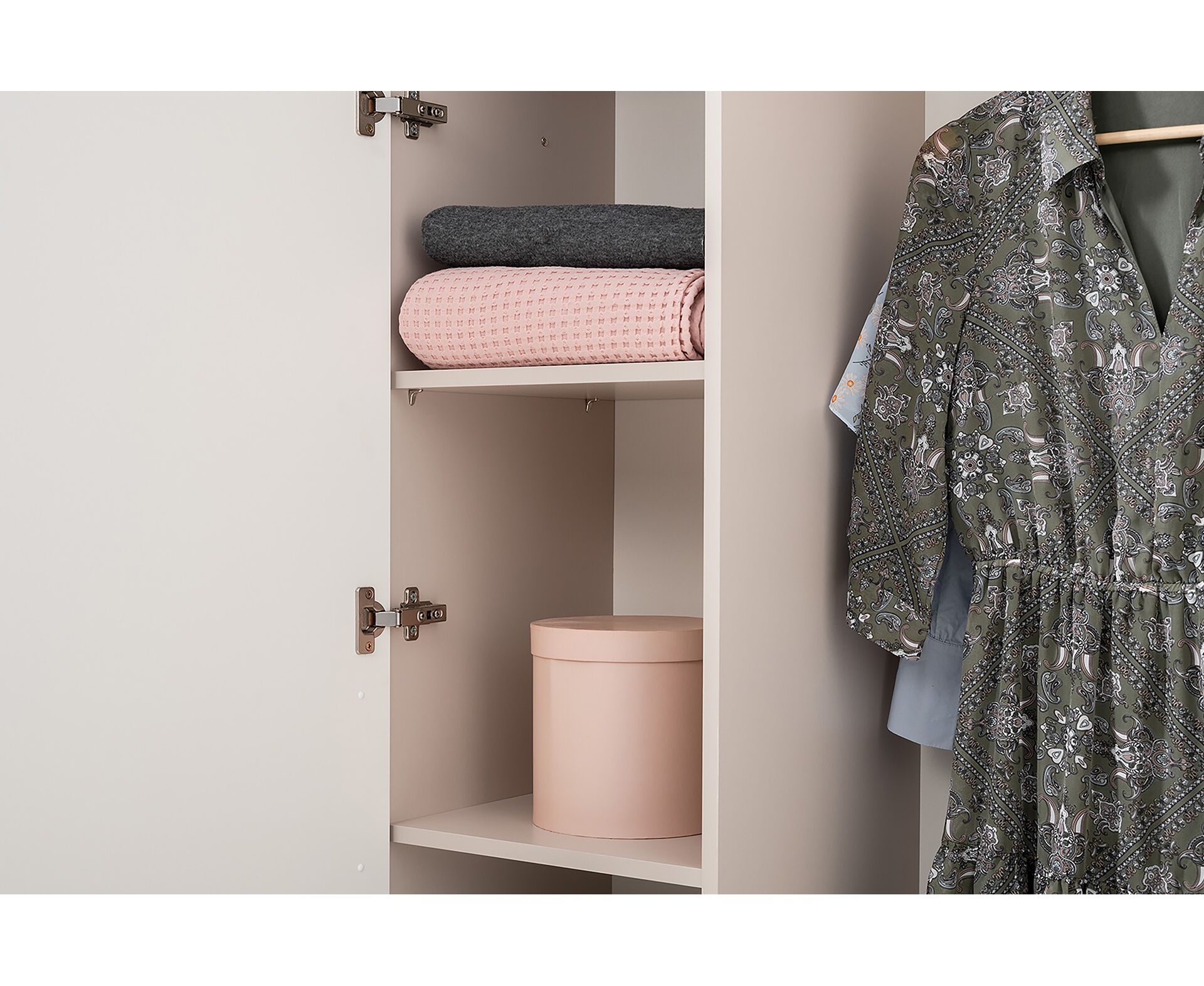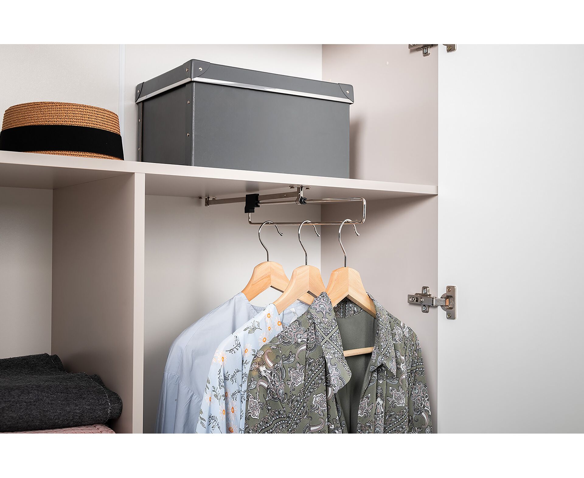 Петли с доводчиками, полное выдвижение ящиков, выдвижная штанга в шкафу для одежды и съемные полки делают использование максимально комфортным.