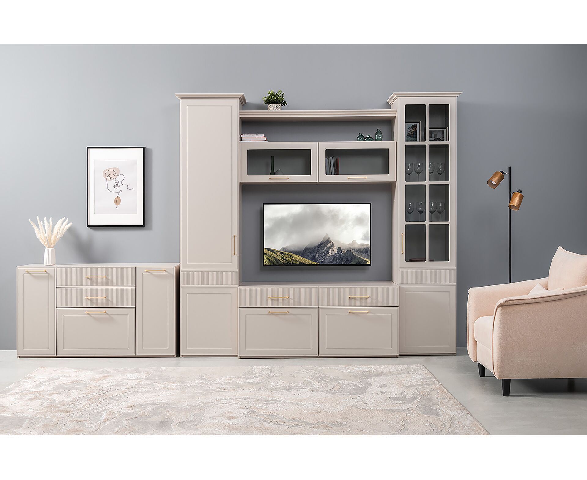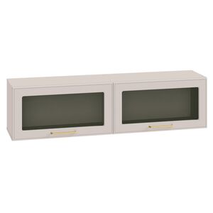 Фрезерованные фасады из МДФ, металлические ручки и витрины с тонированным стеклом создают изысканный образ.