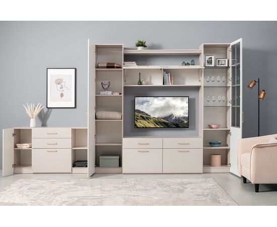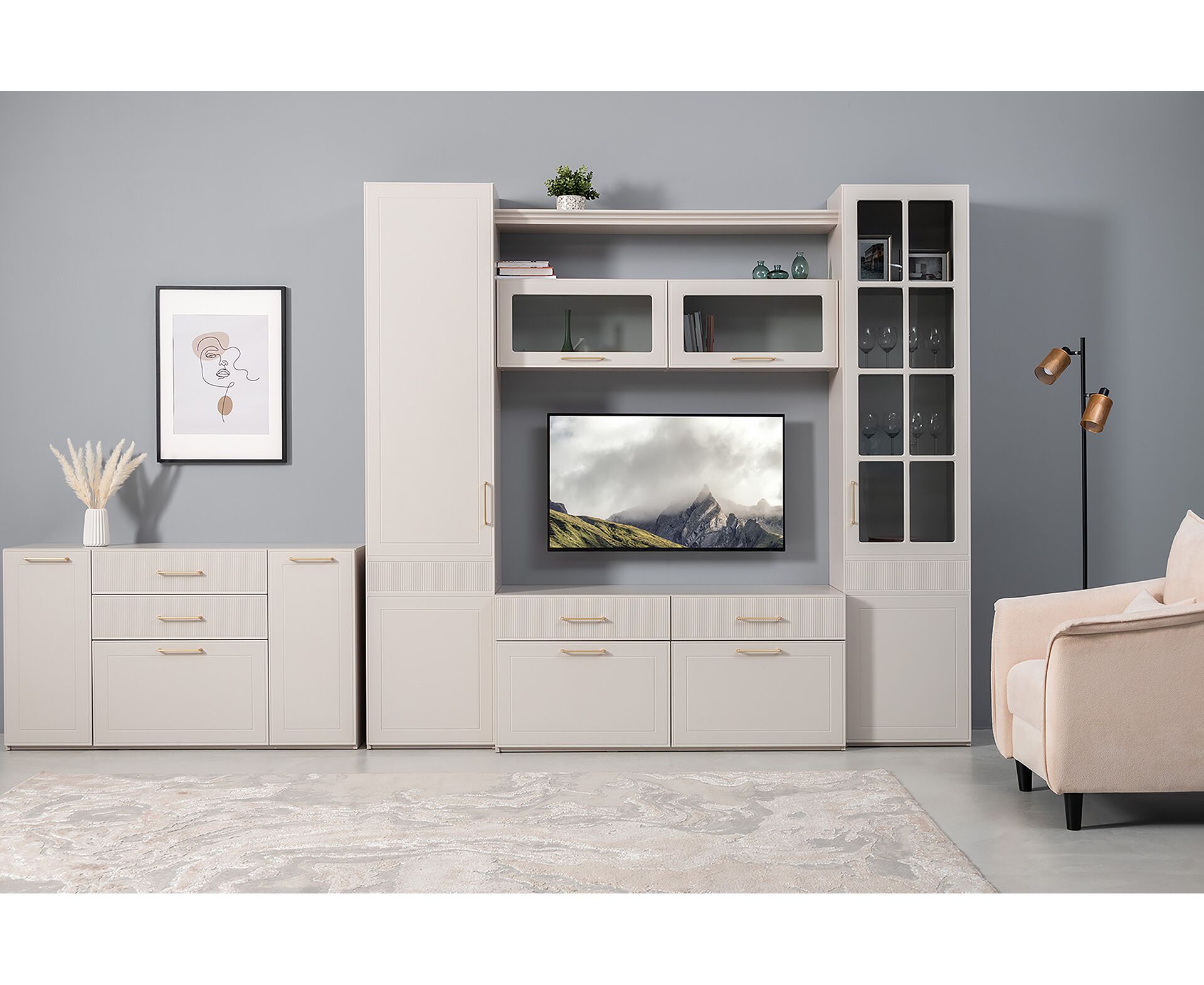 Фрезерованные фасады из МДФ, металлические ручки и витрины с тонированным стеклом создают изысканный образ.