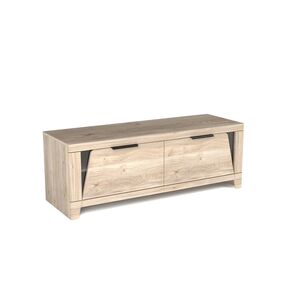 В конструкции тумбы по ТВ нет острых углов, округлость и мягкость придают декоративные планки. Металлические ручки-профиль выполненные в черном цвете подчеркивают натуральный древесный декор.