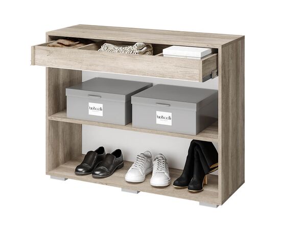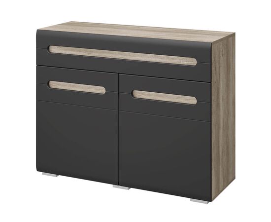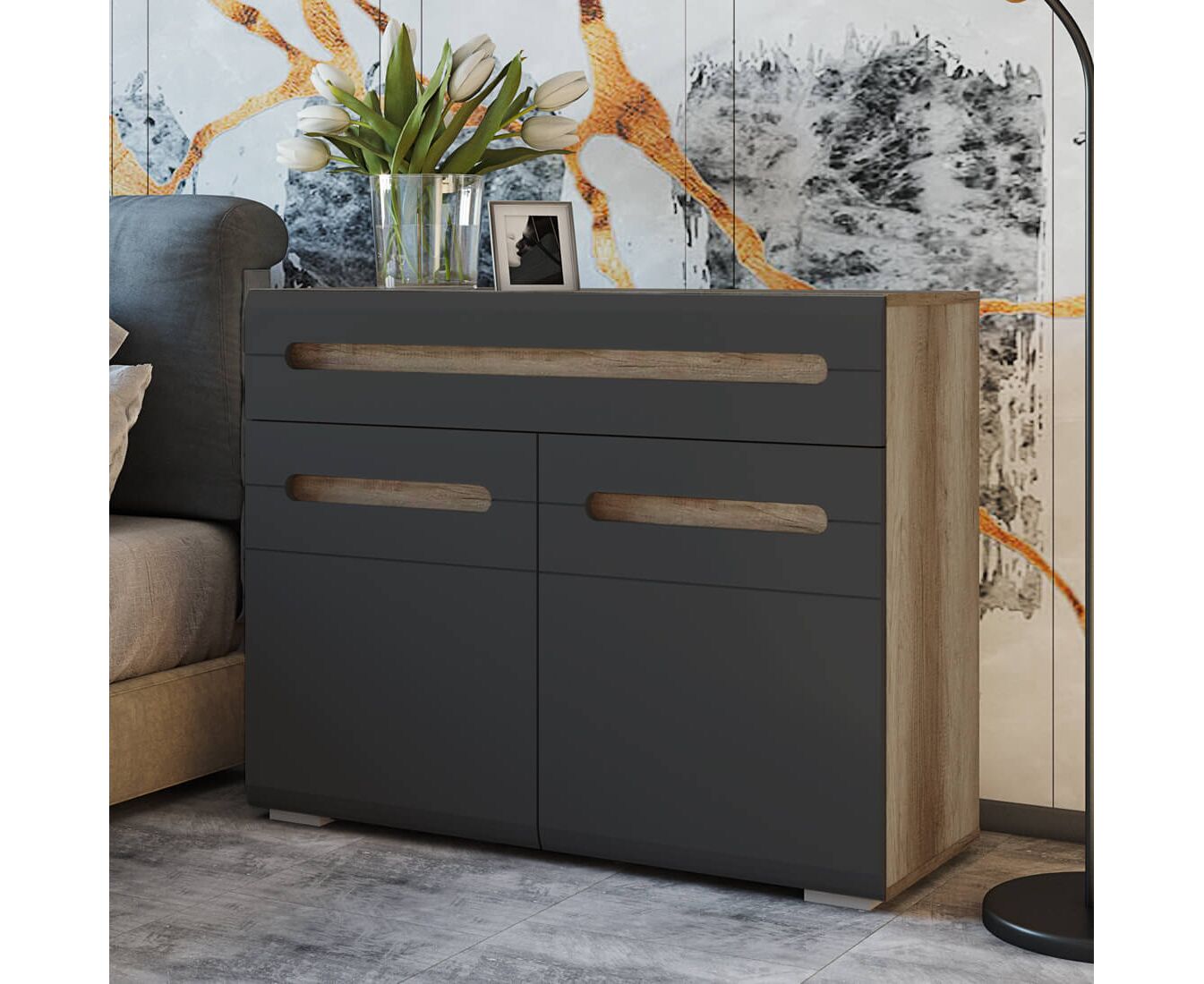 Неглубокая тумба "Наоми" может использоваться в любой комнате вашей квартиры или дома. Модель оснащена одним выдвижным ящиком и двумя распашными дверцами, за которыми находятся полки для хранения. Изделие имеет характерную для коллекции "Наоми" отделку: корпус выполнен из ЛДСП в цвете "дуб каньон", а темно-серые фасады имеют интегрированные ручки.