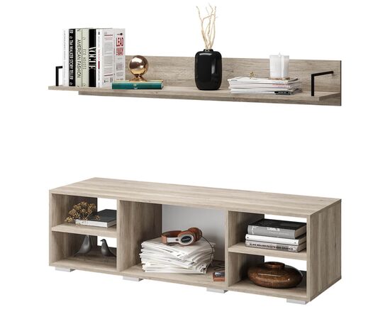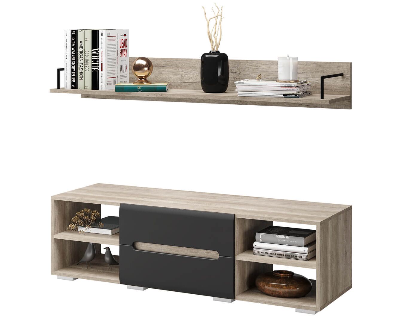 Стильная и очень вместительная комбинация из тумбы под ТВ и полки "Наоми" является частью одноимённой модульной серии. Модель выполнена из качественной ЛДСП в цвете "дуб каньон", а фасад одного из ящиков отделан МДФ темного серого цвета. На столешнице тумбы поместится телевизор практически любого размера, а в нишах можно хранить необходимую технику. Навесная полка станет прекрасным решением для размещения предметов декора, книг или рамок с фотографиями. Створка у тумбы распашная.