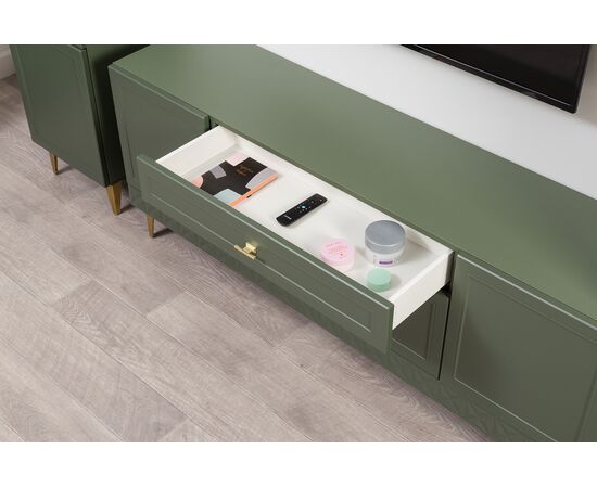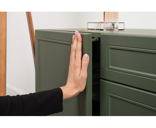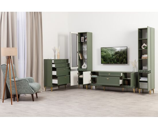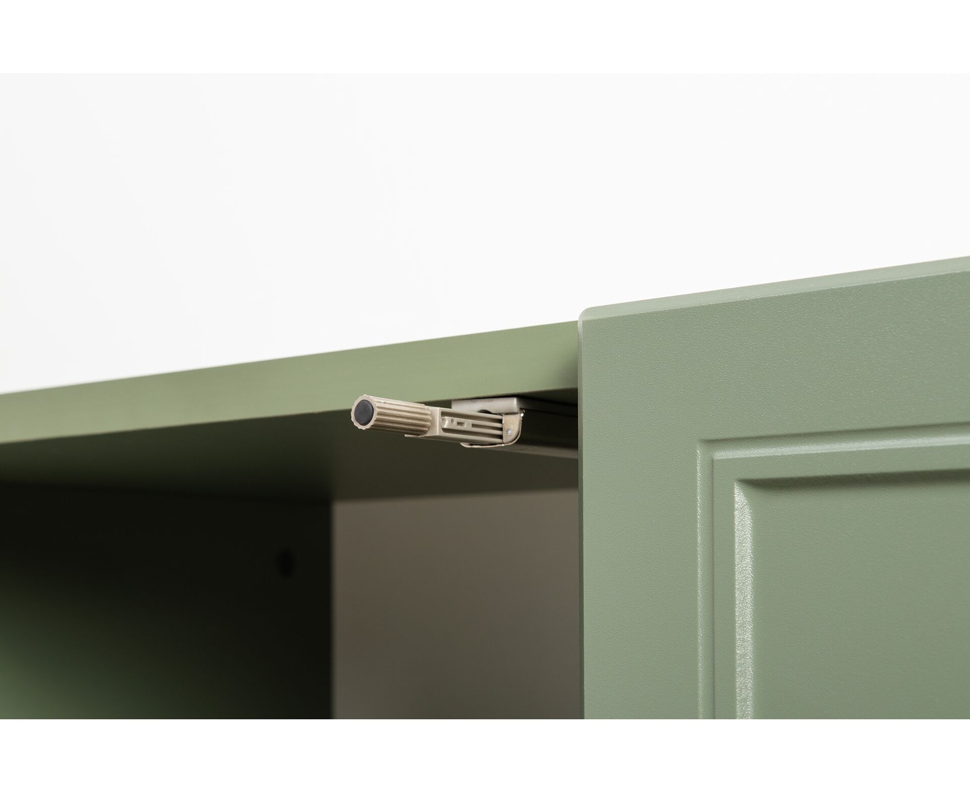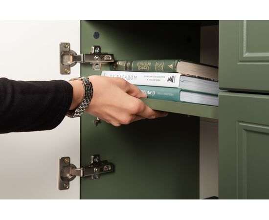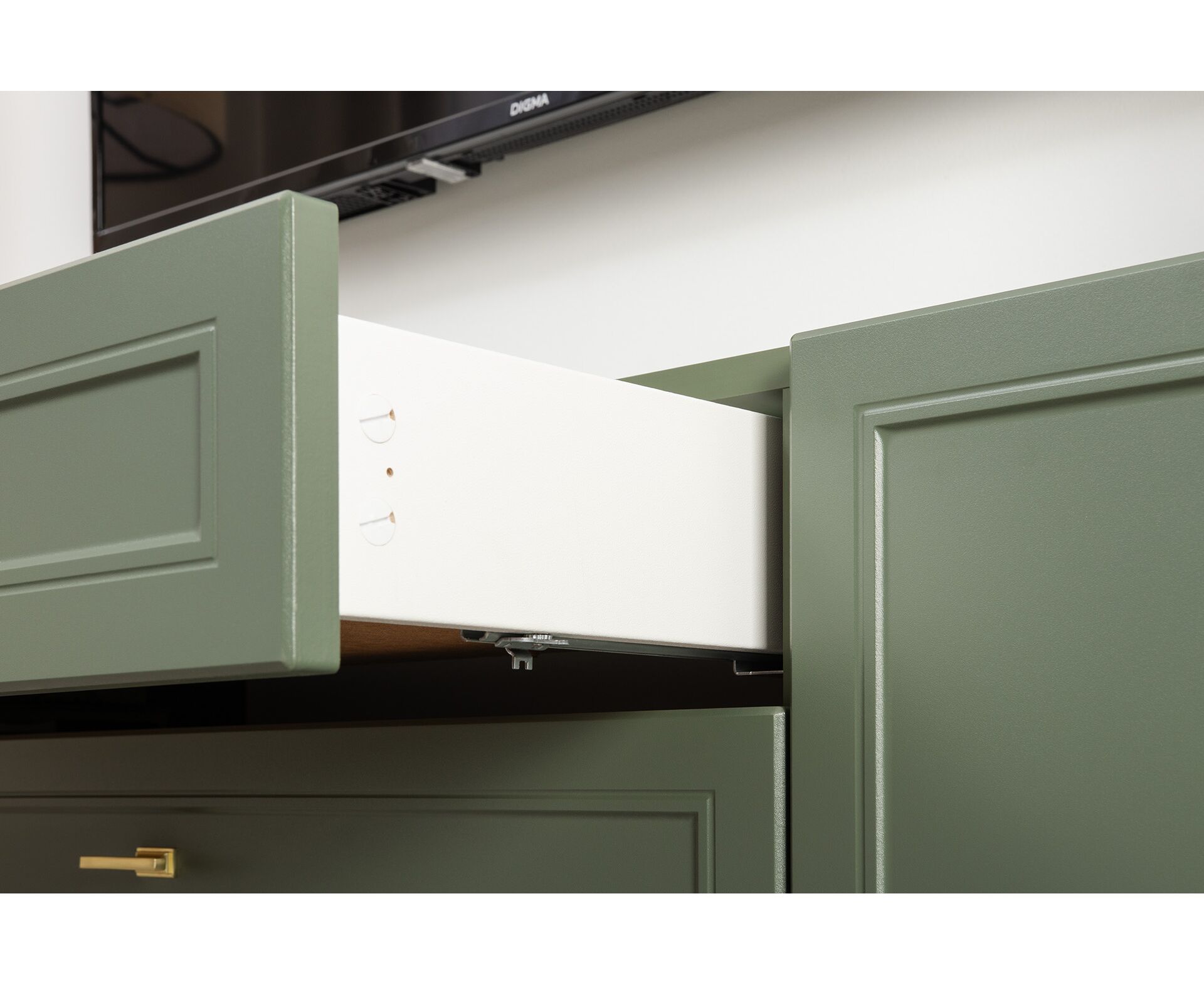Коллекция создана в двух вариантах цвта: утончённая «Слоновая кость» и изысканная «Олива Шагрень» с глубоким зелёным тоном — создают атмосферу уюта, тепла и благородства. Металлические ручки и опоры золотого цвета придают мебели утончённый блеск, а петли и направляющие с доводчиками обеспечивают плавное и бесшумное закрытие фасадов.