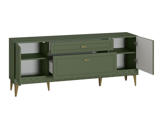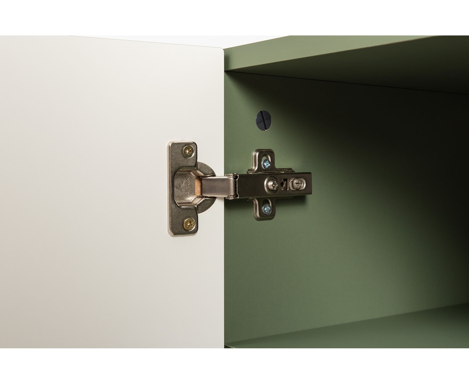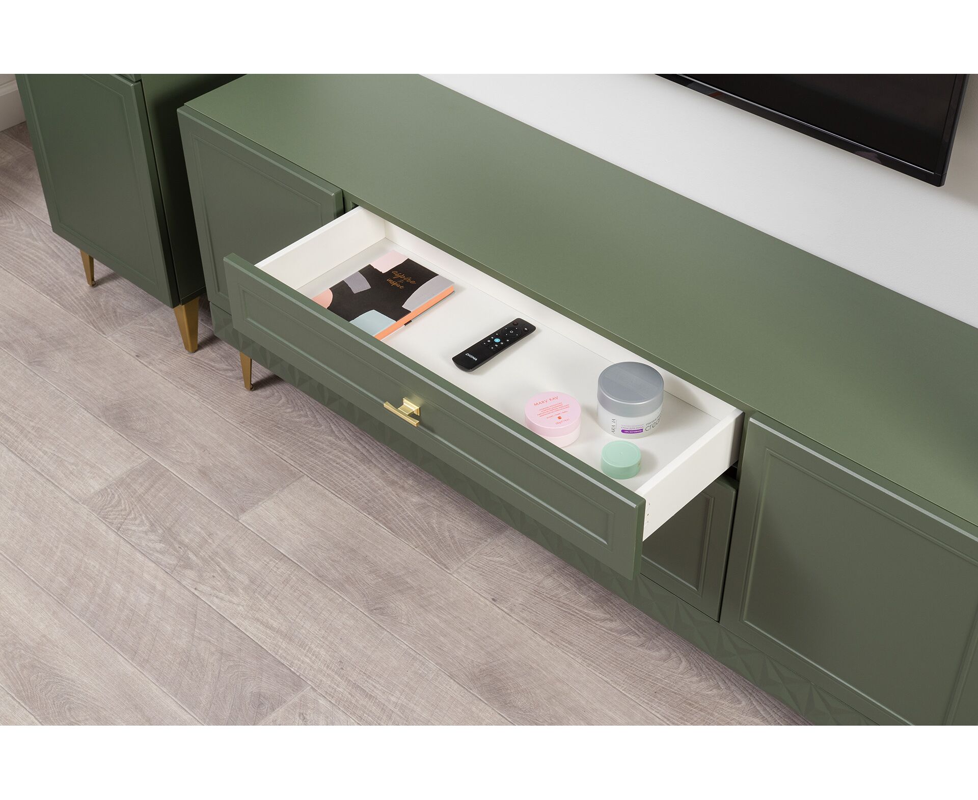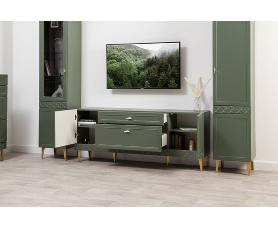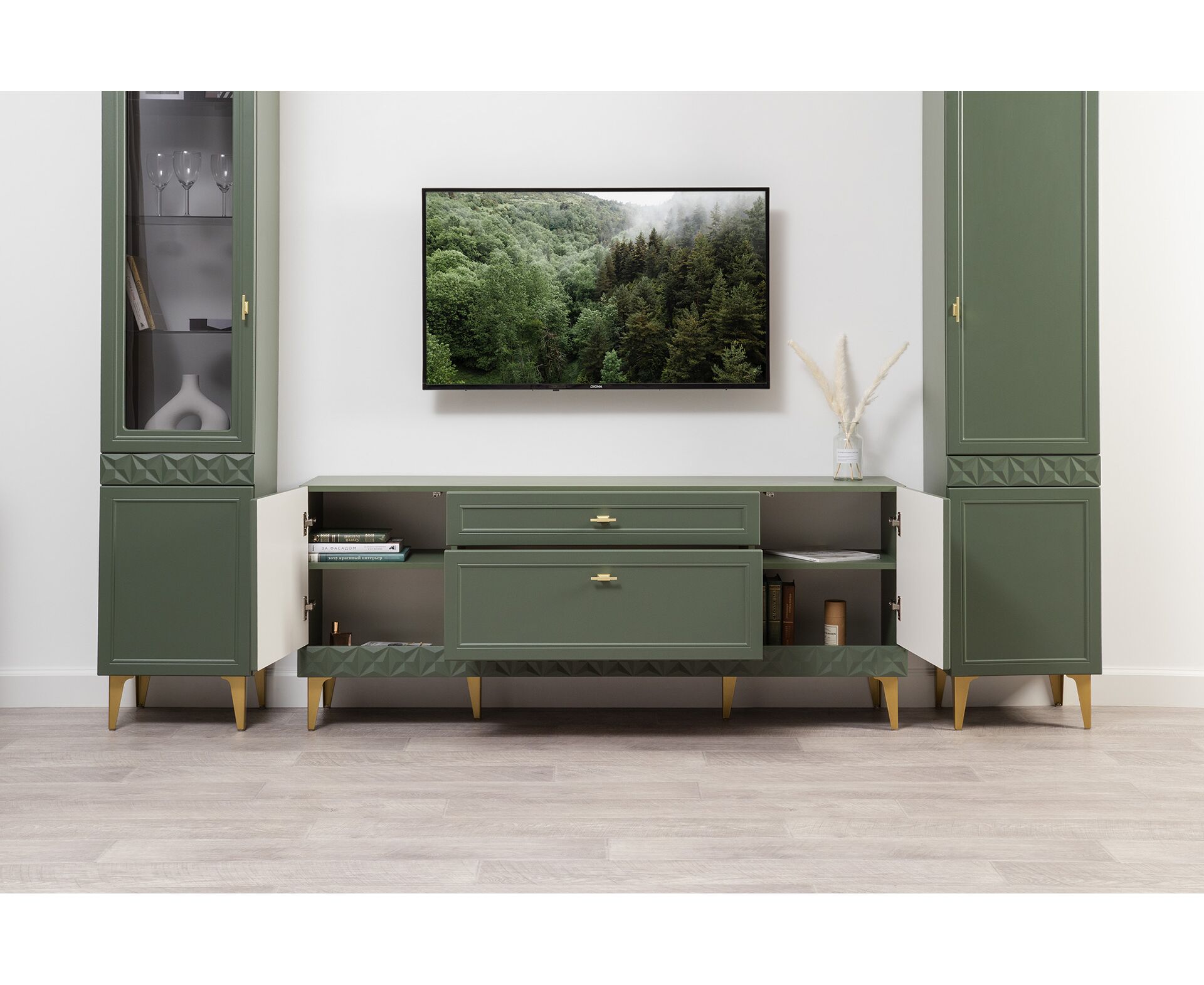 Коллекция создана в двух вариантах цвта: утончённая «Слоновая кость» и изысканная «Олива Шагрень» с глубоким зелёным тоном — создают атмосферу уюта, тепла и благородства. Металлические ручки и опоры золотого цвета придают мебели утончённый блеск, а петли и направляющие с доводчиками обеспечивают плавное и бесшумное закрытие фасадов.
