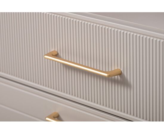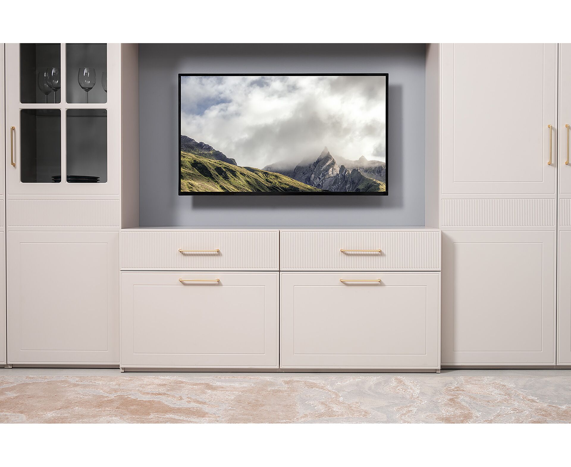 Фрезерованные фасады из МДФ, металлические ручки и витрины с тонированным стеклом создают изысканный образ.