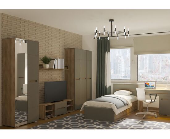 Модульная коллекция «Наоми» – это стильное современное решение в контрастном сочетании корпуса «дуб каньон» с элегантным матовым фасадом насыщенного грифельного оттенка. Оригинальное конструктивное решение коллекции – ручки фасадов, выполненные путем сложной фрезеровки с максимально реалистичным декором дубового спила.