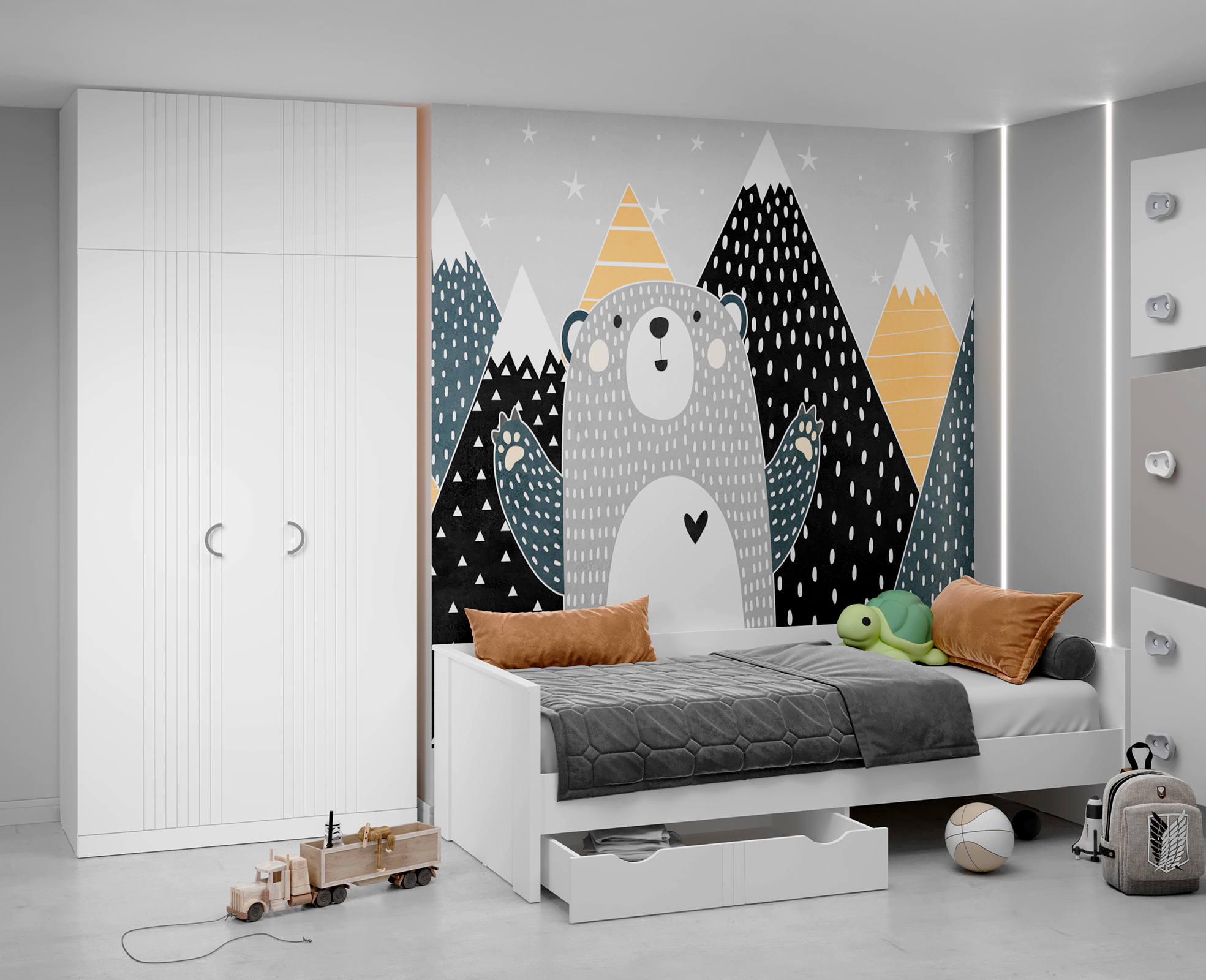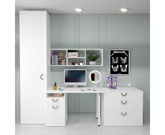 Санти - универсальная модульная детская мебель, которая позволяет легко и гармонично организовать пространство детской комнаты. Выполнена в светлых тонах, корпусная мебель оснащена стильными металлическими ручками. Фасады МДФ цвет бланж, корпус - ЛДСП белое сияние.