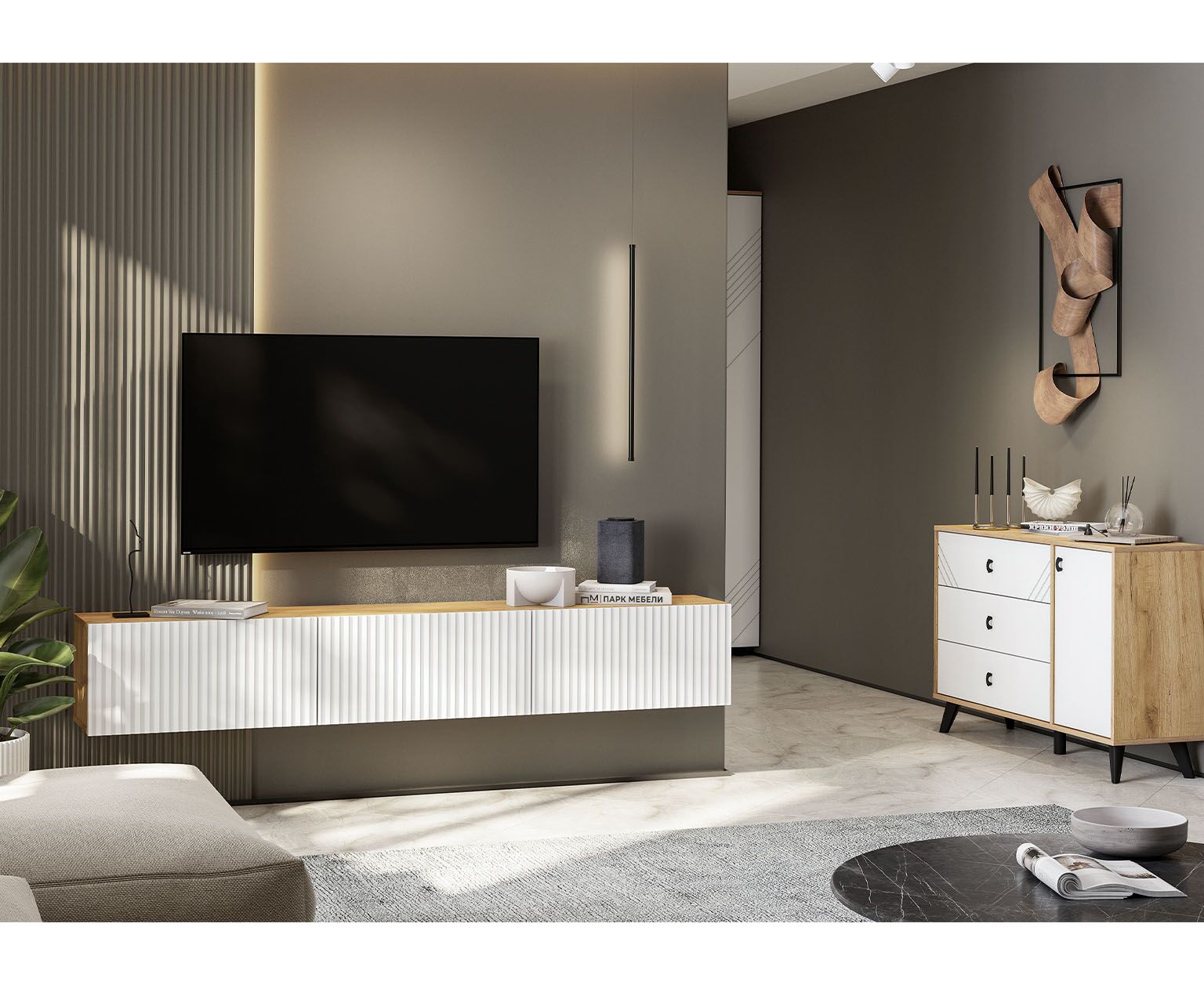 Модульная система "Байкал" - это невероятное сочетание корпуса ЛДСП в цвете "Дуб золотой" и МДФ-фасадов в цветах "Белый матовый" и "Графит".