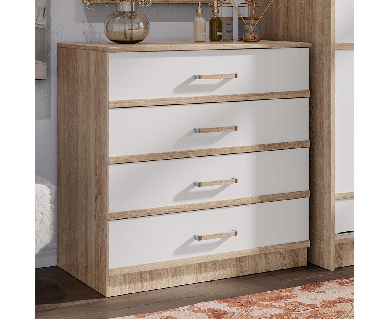Вместительный комод с четырьмя выдвижными ящиками на роликовых направляющих из спальной коллекции Сакура.