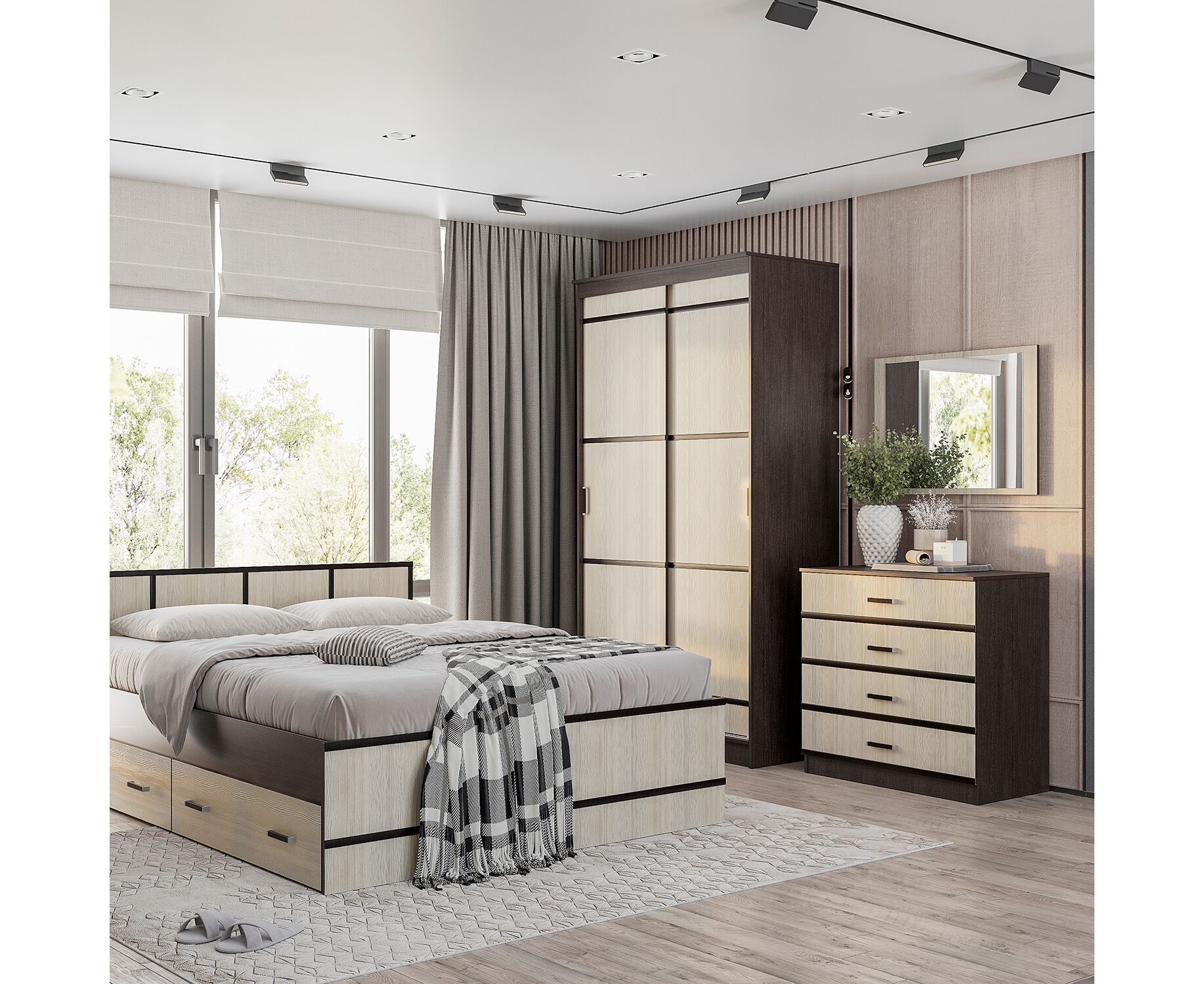 Модульная система Сакура — аккуратный стильный интерьер, являющийся залогом хорошего впечатления о Вашем доме, начиная с прихожей, спальни, детской и даже гостиной. Коллекция оснащена обилием разнообразных распашных и шкафов-купе, удобными кроватями с выдвижными ящиками, малыми формами, секциями для хранения одежды и обуви. Лаконичный дизайн хорошо гармонирует со стилем модерн. В этой модульной системе все продумано до мелочей. Теплые оттенки привносят в Ваш дом свет и визуально делают пространство свободнее, а каркас из темного дерева добавляет основательности.