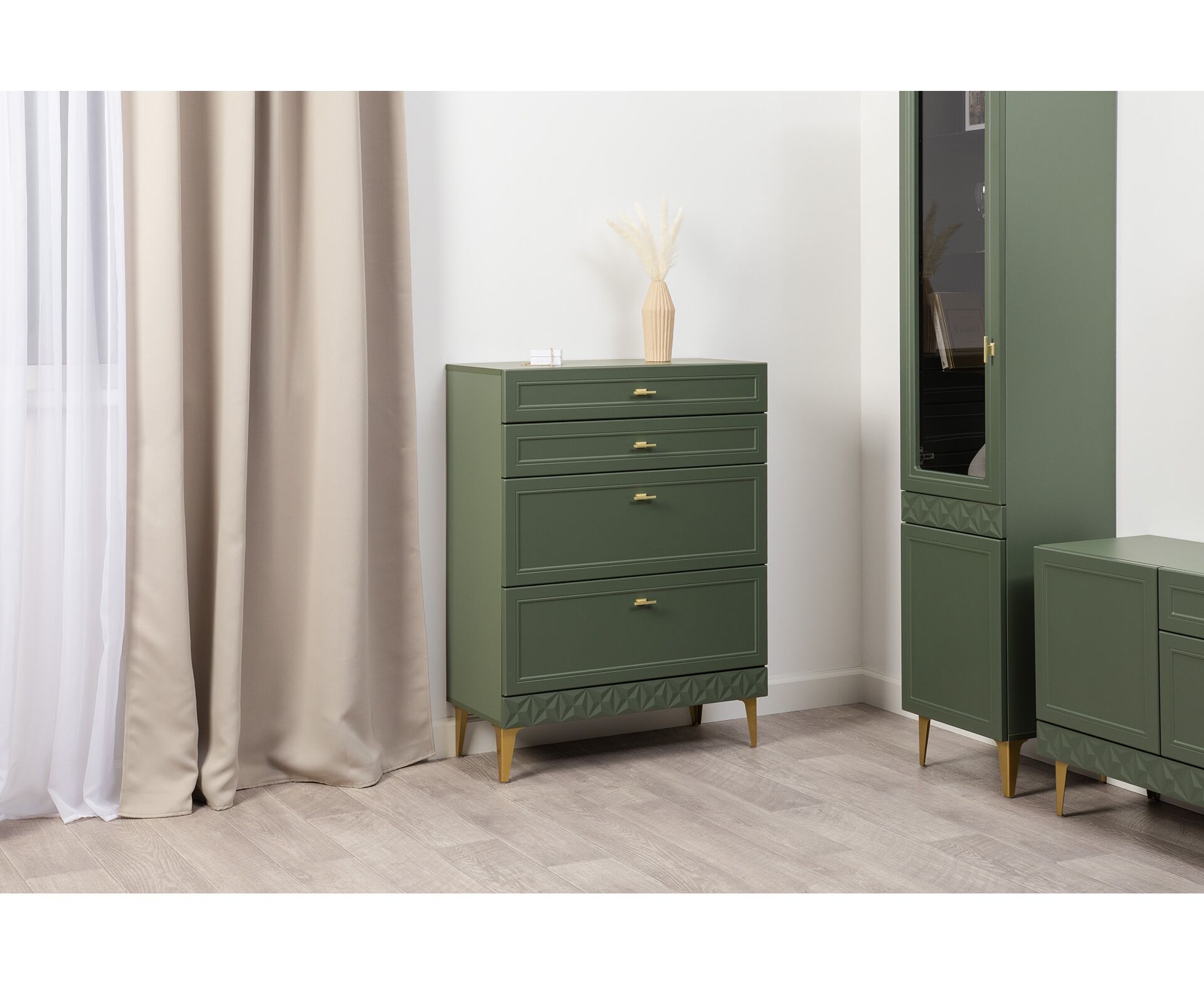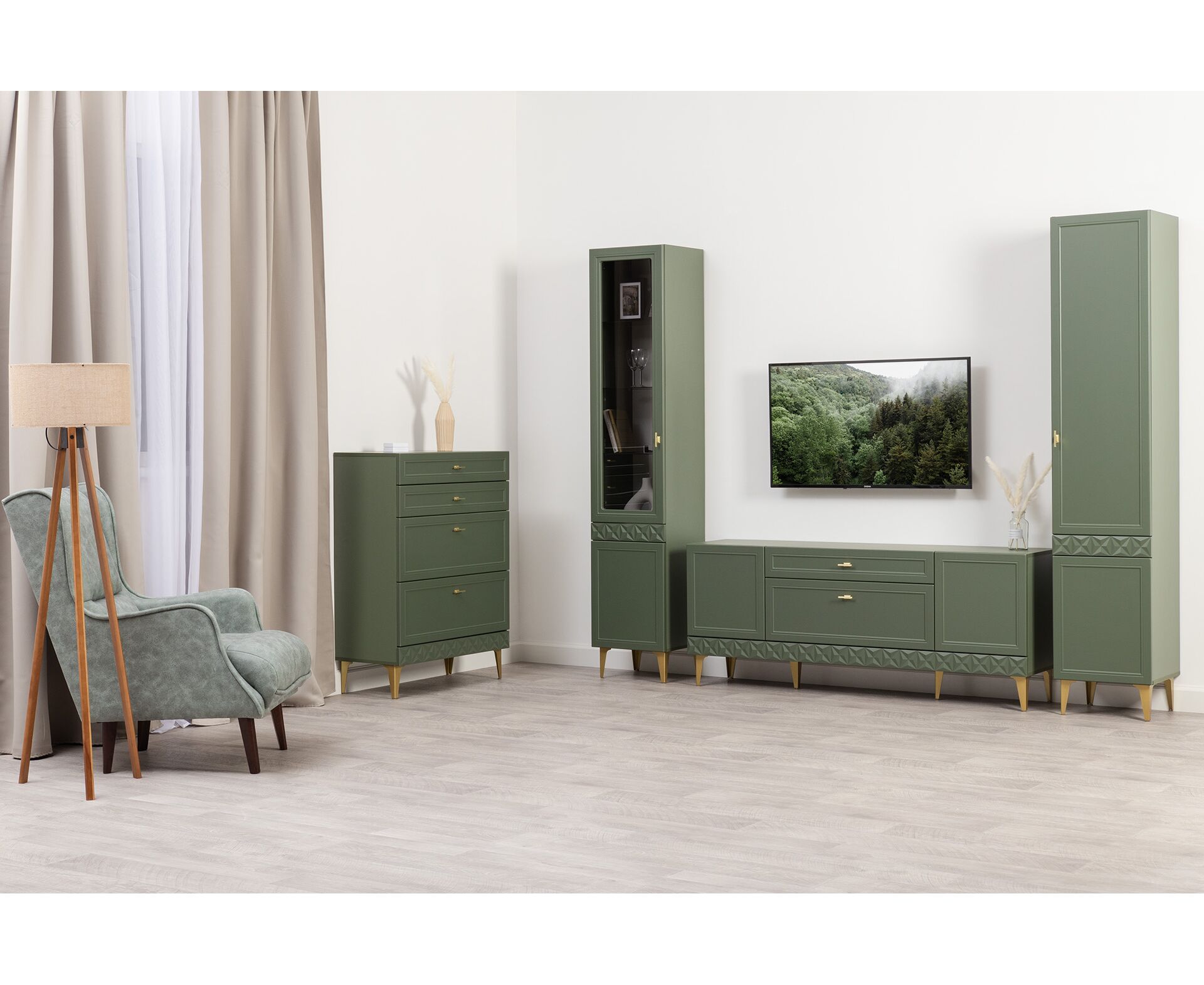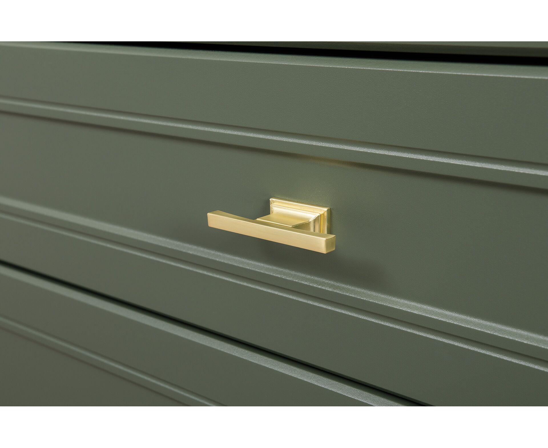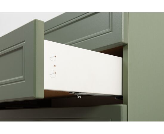 Коллекция создана в двух вариантах цвта: утончённая «Слоновая кость» и изысканная «Олива Шагрень» с глубоким зелёным тоном — создают атмосферу уюта, тепла и благородства. Металлические ручки и опоры золотого цвета придают мебели утончённый блеск, а петли и направляющие с доводчиками обеспечивают плавное и бесшумное закрытие фасадов.