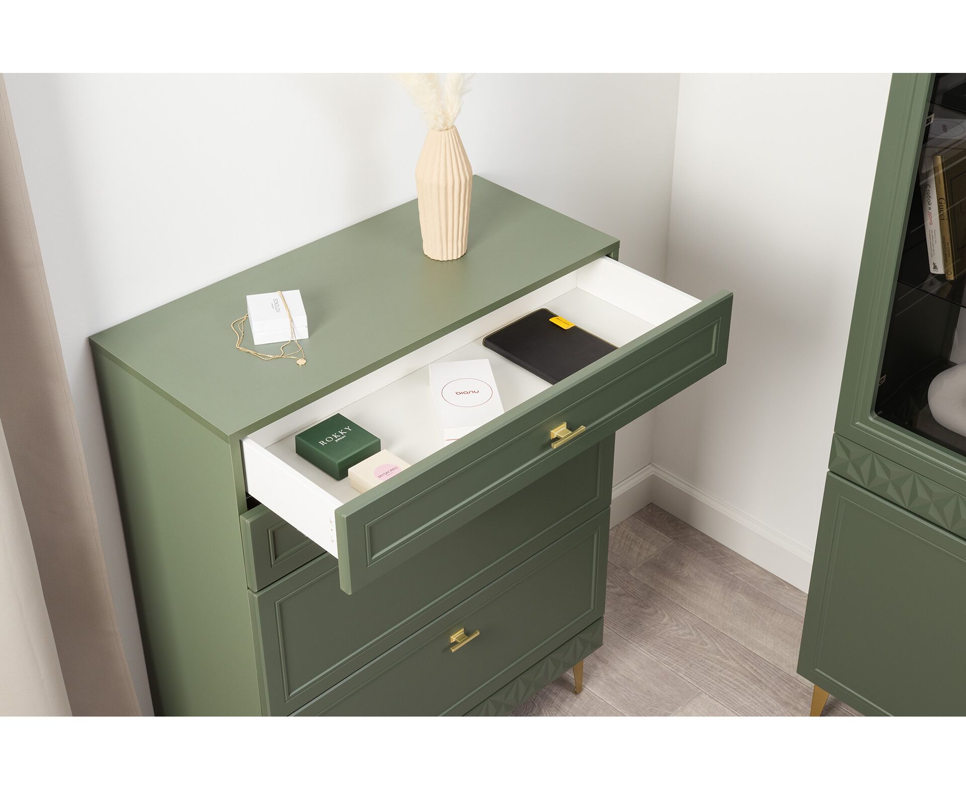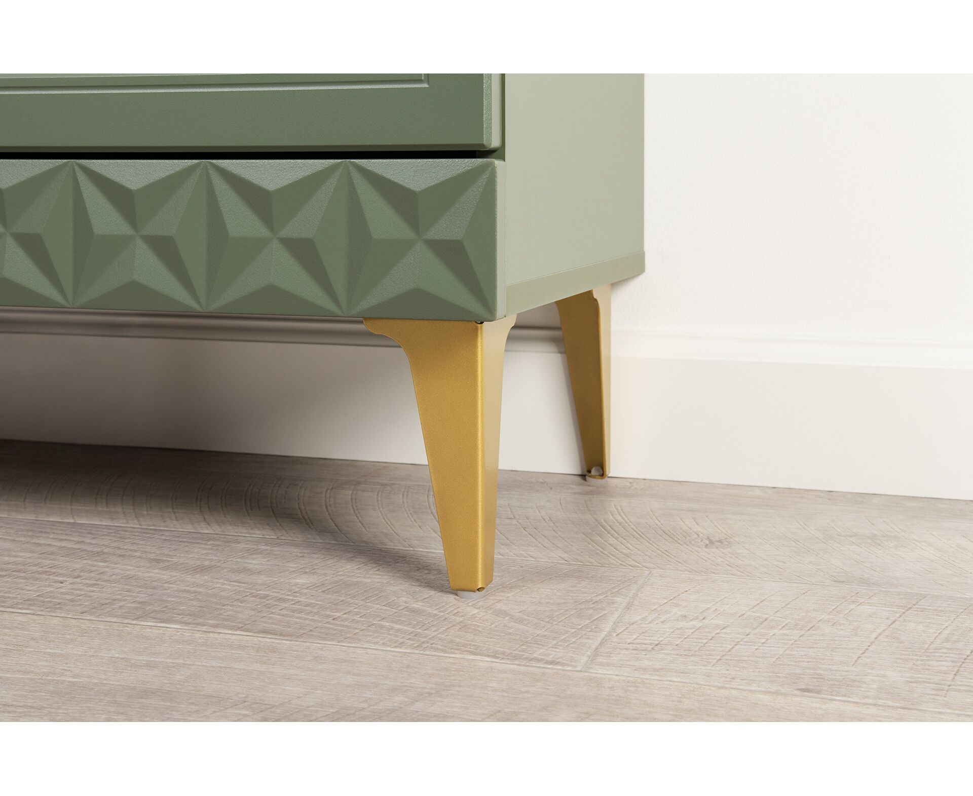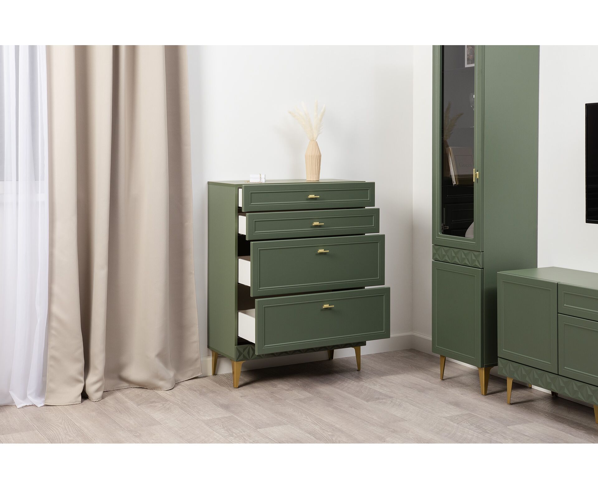 Коллекция создана в двух вариантах цвта: утончённая «Слоновая кость» и изысканная «Олива Шагрень» с глубоким зелёным тоном — создают атмосферу уюта, тепла и благородства. Металлические ручки и опоры золотого цвета придают мебели утончённый блеск, а петли и направляющие с доводчиками обеспечивают плавное и бесшумное закрытие фасадов.