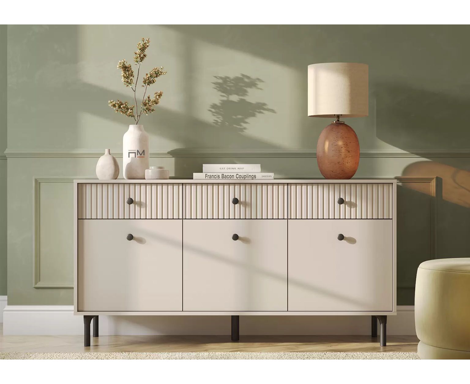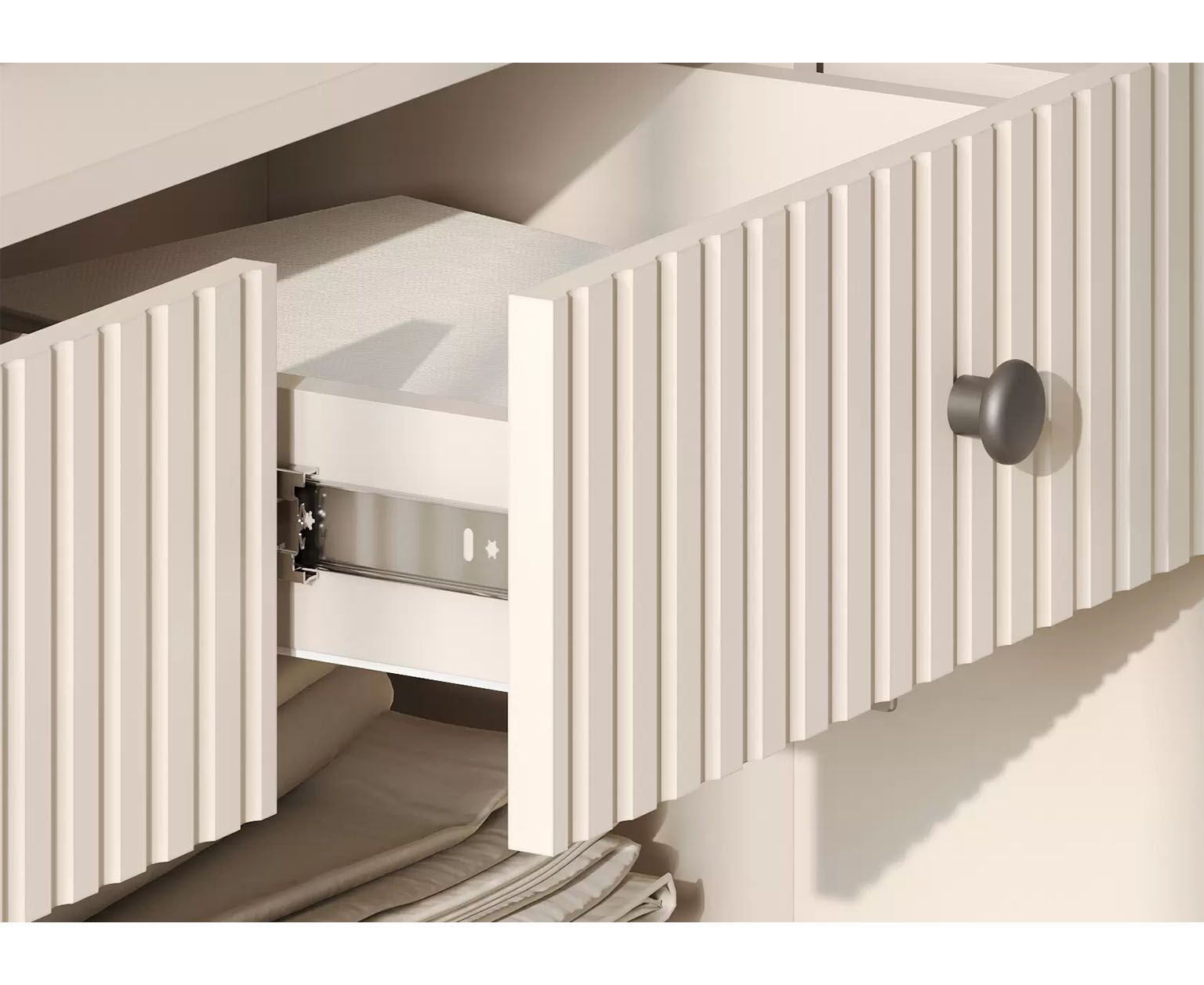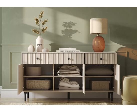 Комод «Сингапур» сочетает элегантный дизайн и практичность, помогая поддерживать идеальный порядок в доме. За распашными дверцами скрываются удобные полки, а выдвижные ящики на шариковых направляющих подходят для хранения одежды, белья, аксессуаров и других вещей.