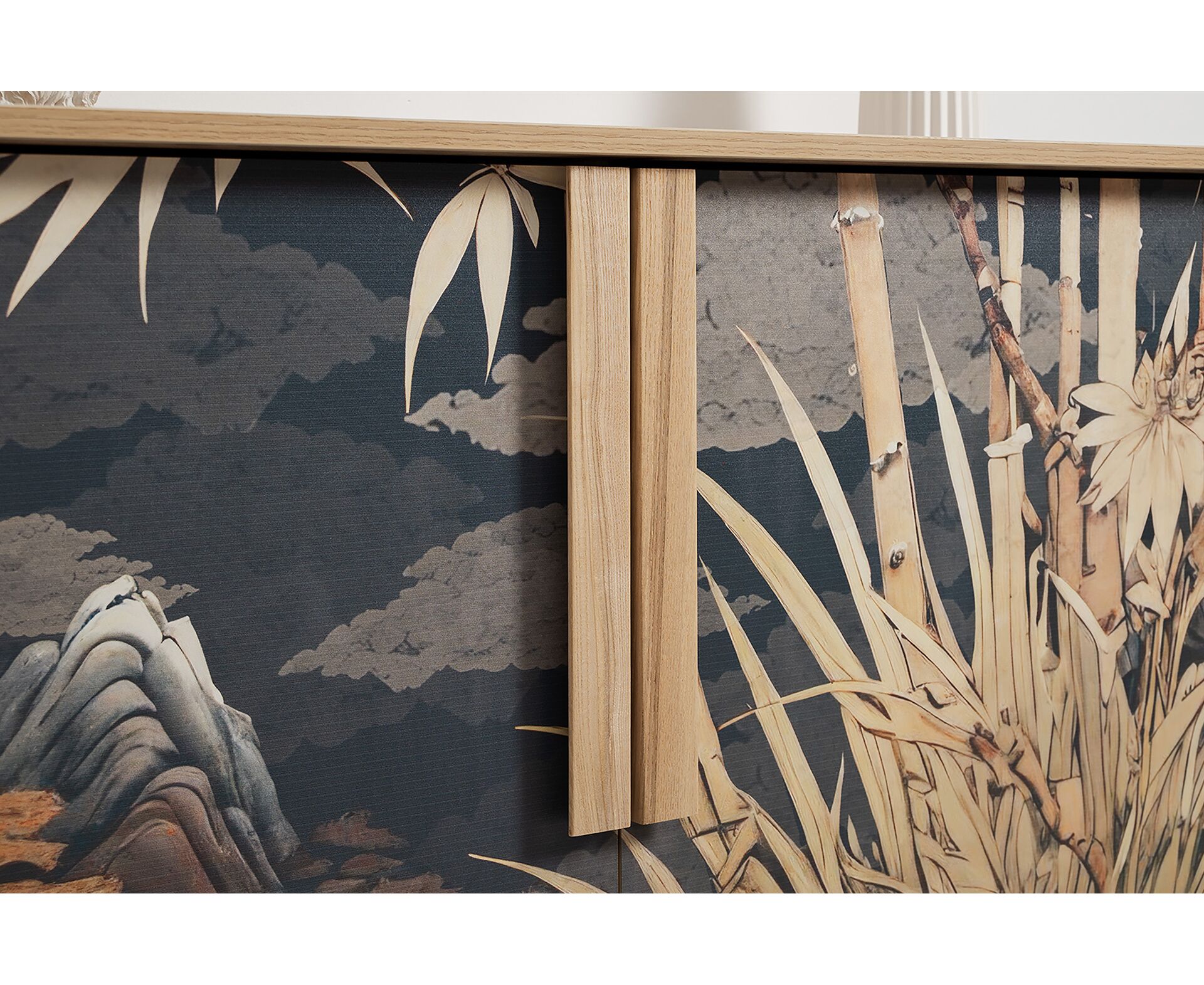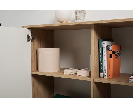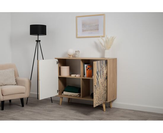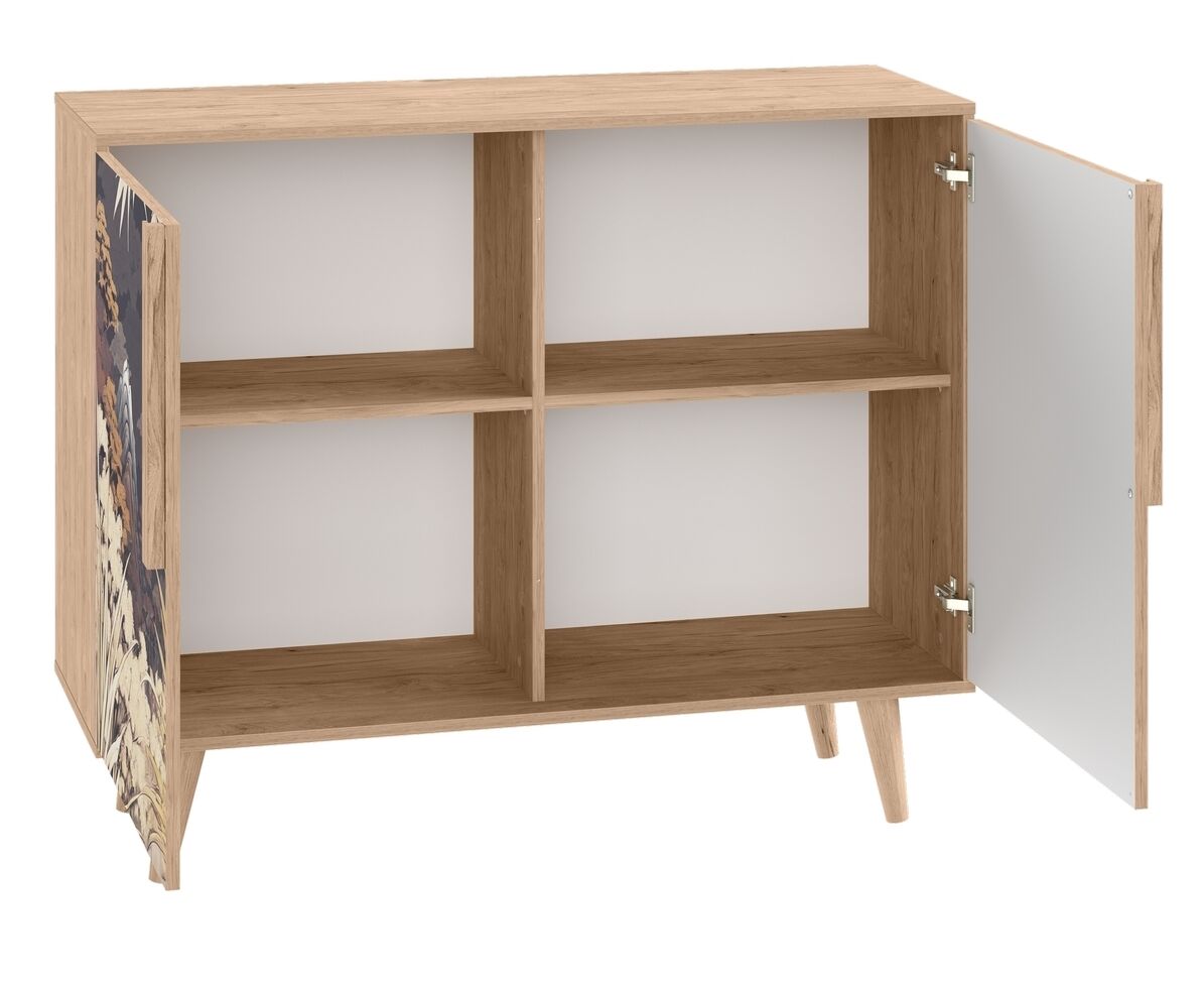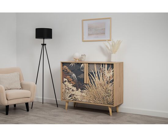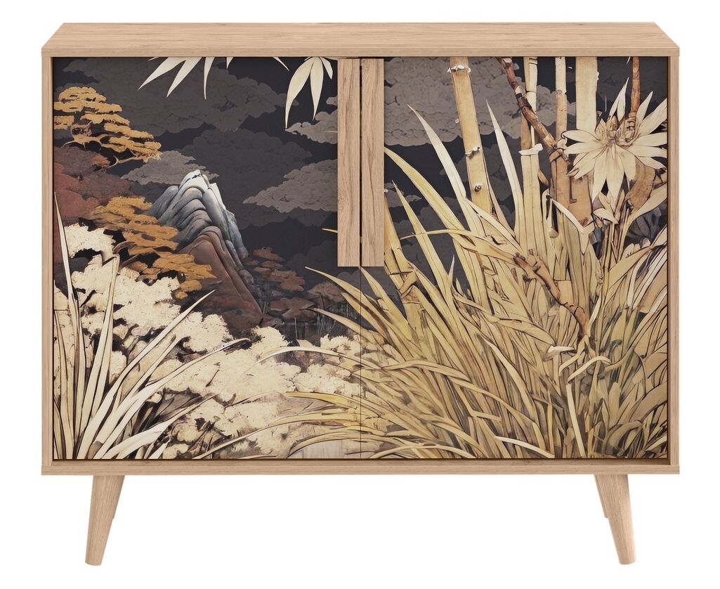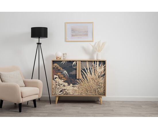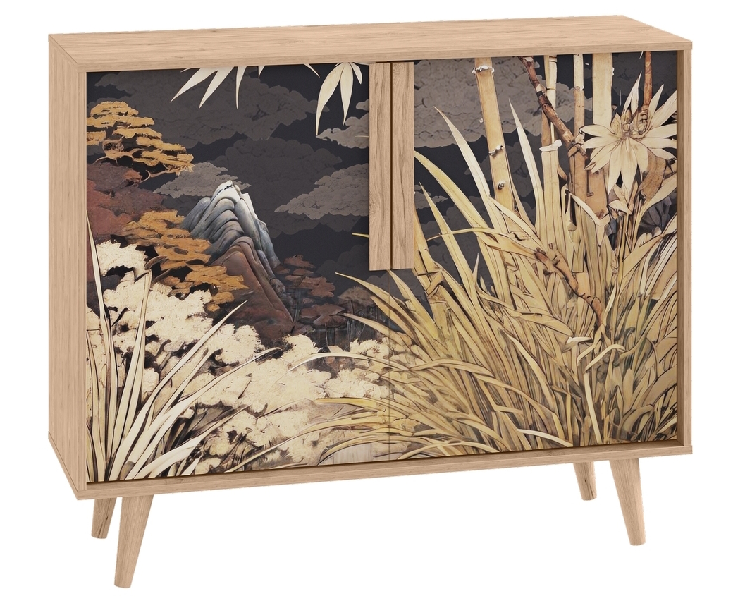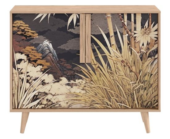 Комод Току 16.230.04 украшают фасады с фотопечатью в восточном стиле, и дополняют ручки и опоры из массива дерева. Вместительные отделения со съемными регулируемыми полками обеспечивают удобное хранение, а углубленные фасады придают конструкции стильную глубину.