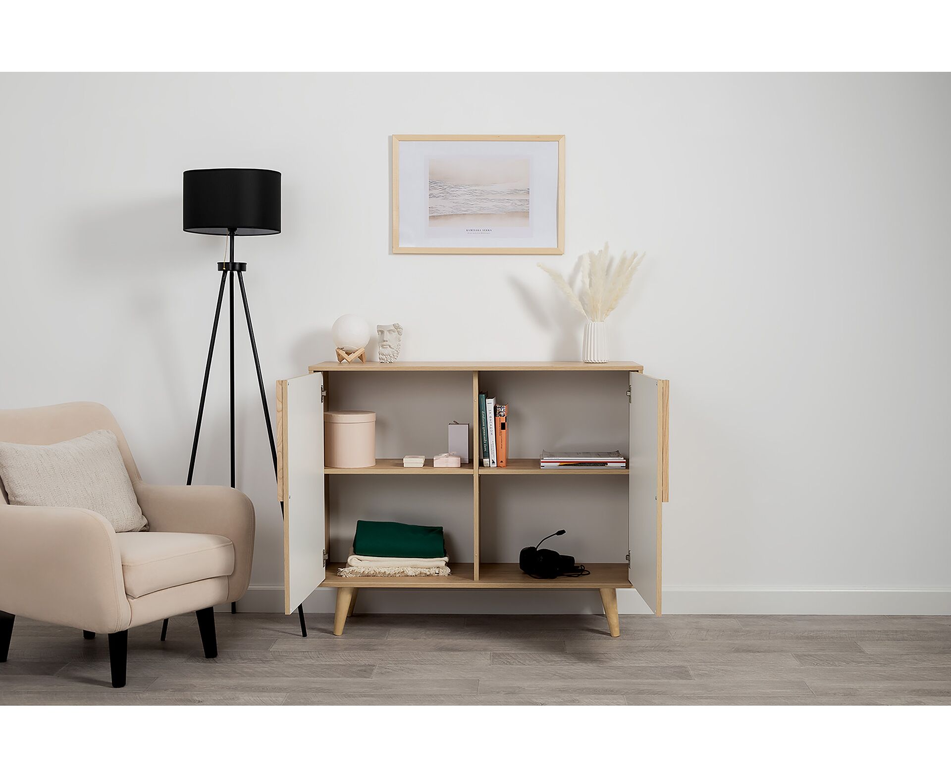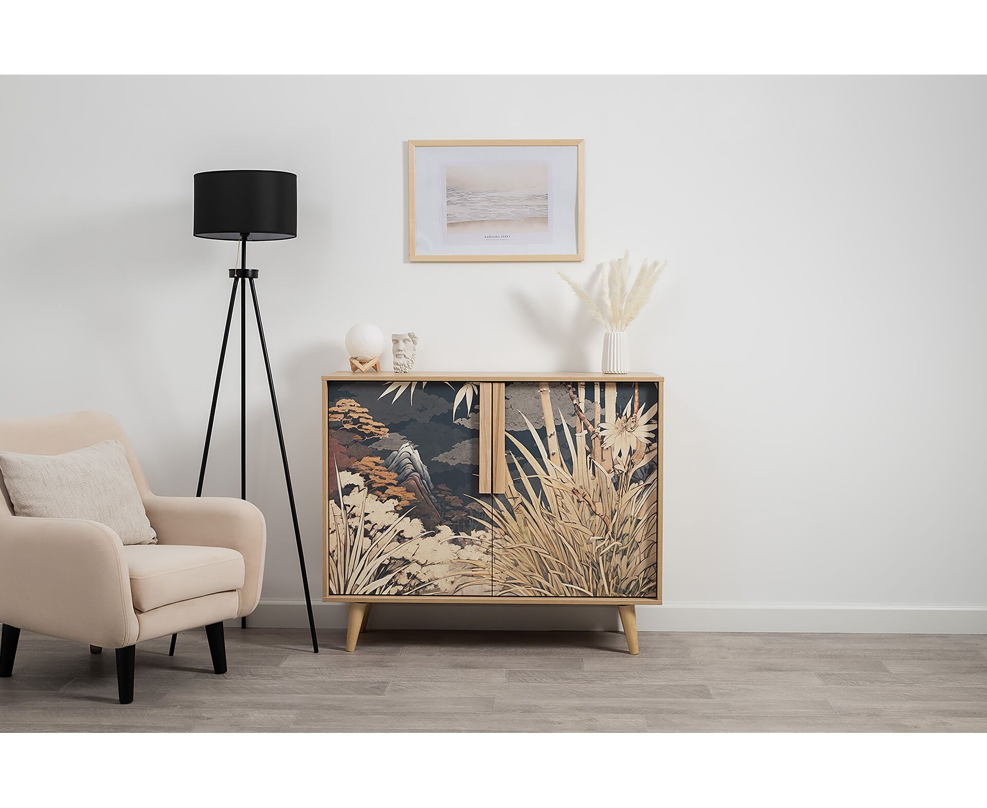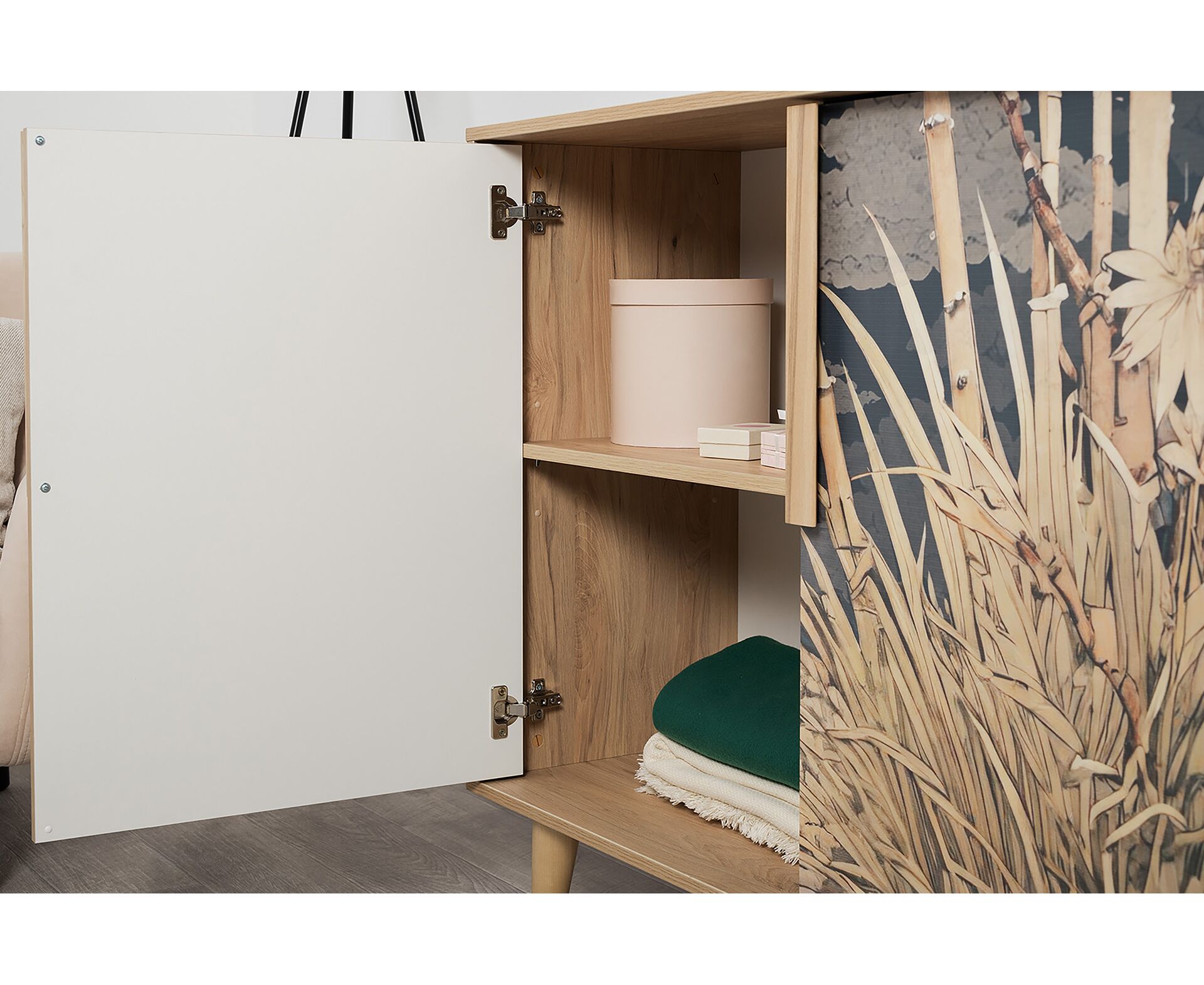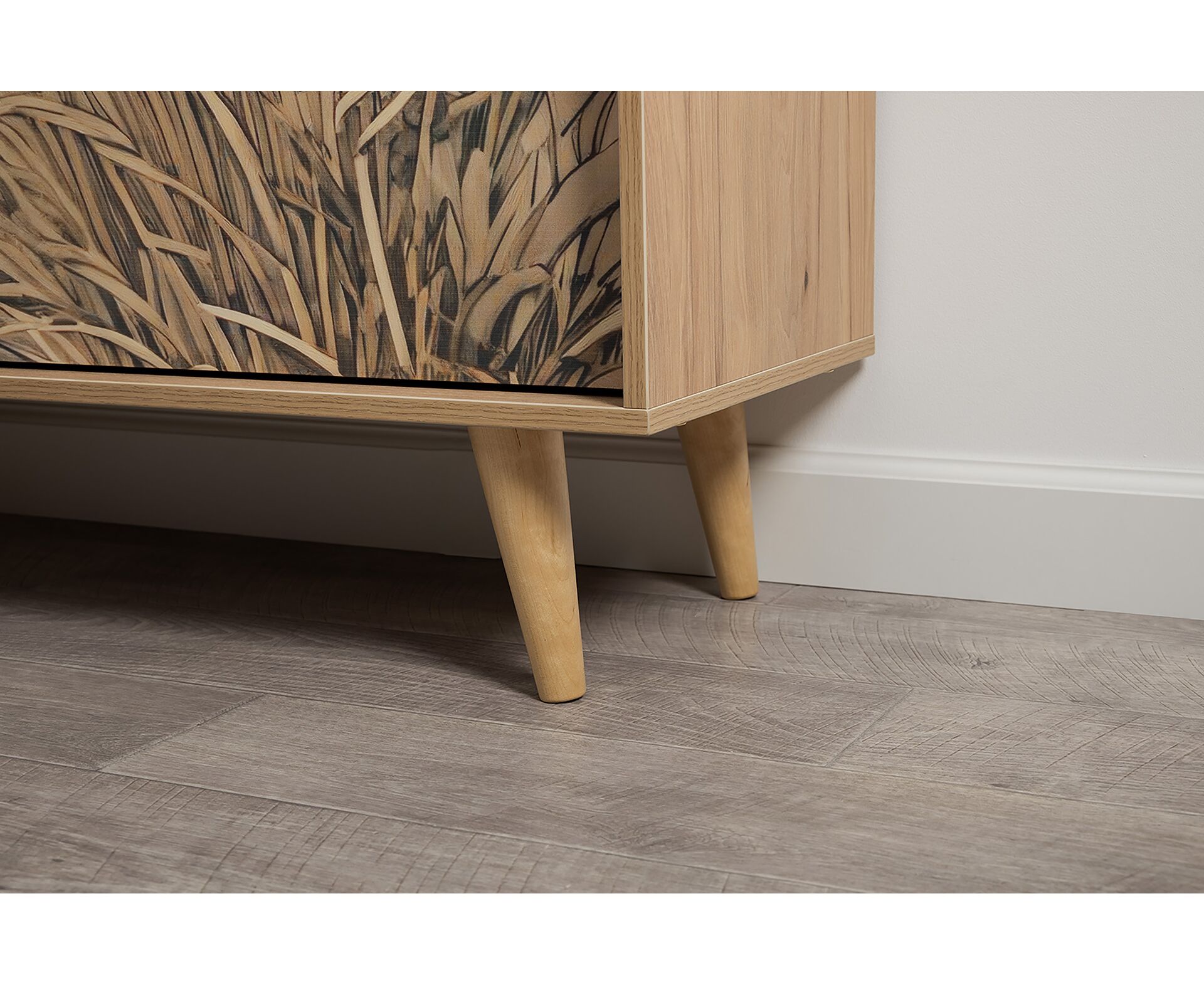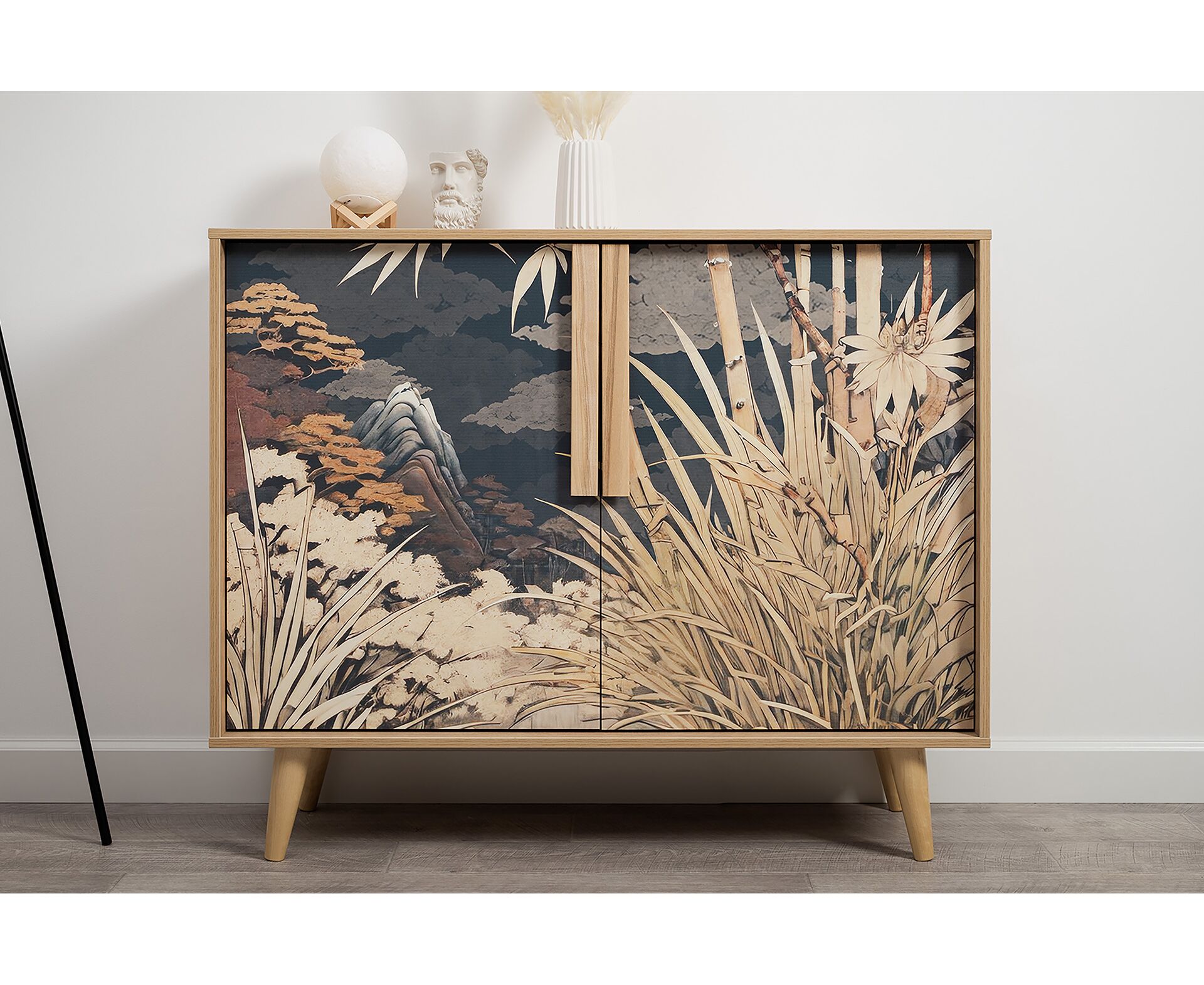 Комод Току 16.230.04 украшают фасады с фотопечатью в восточном стиле, и дополняют ручки и опоры из массива дерева. Вместительные отделения со съемными регулируемыми полками обеспечивают удобное хранение, а углубленные фасады придают конструкции стильную глубину.
