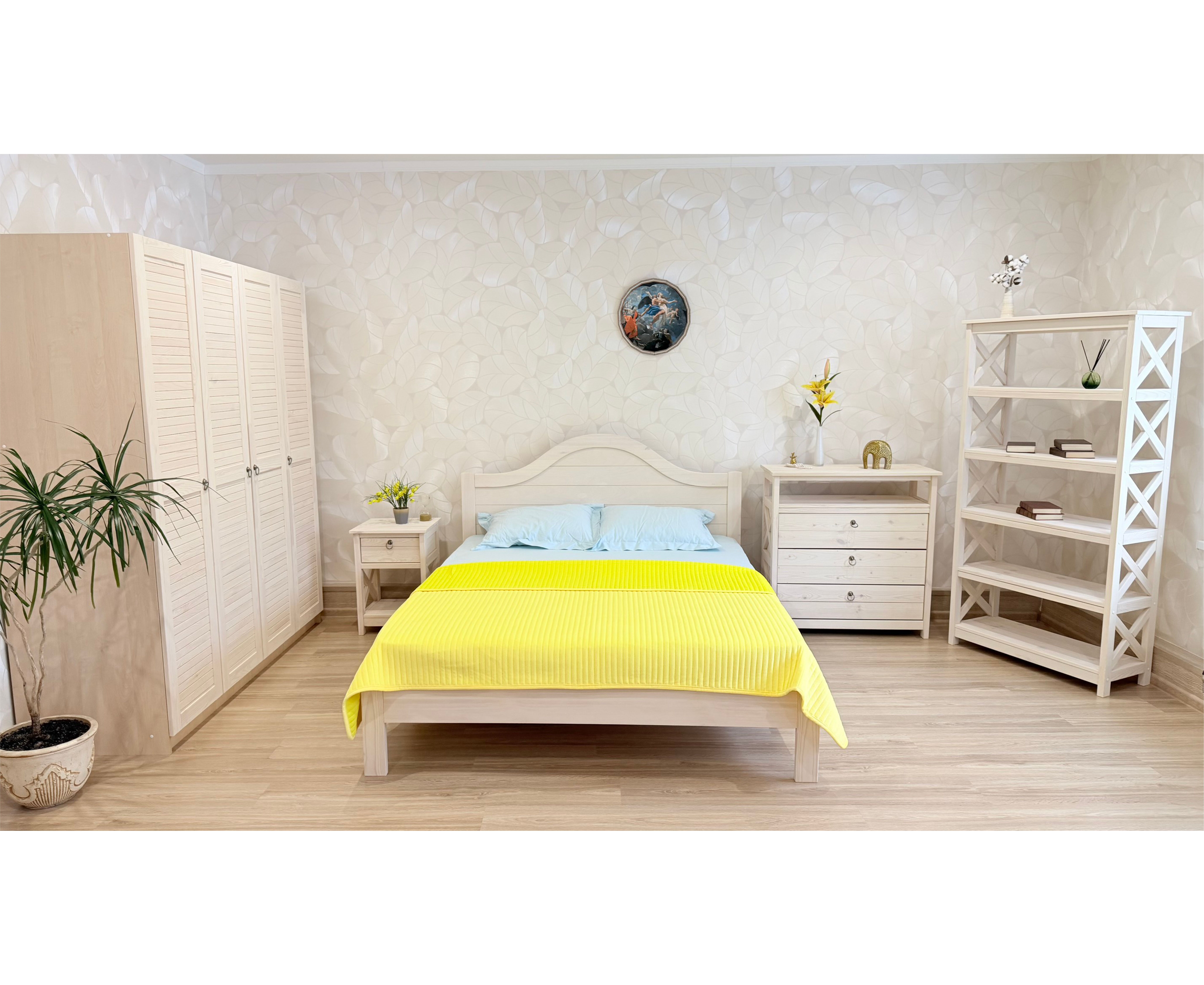 Кровать можно дополнить различными модулями, тумбы, комоды, стеллажи, шкаф.