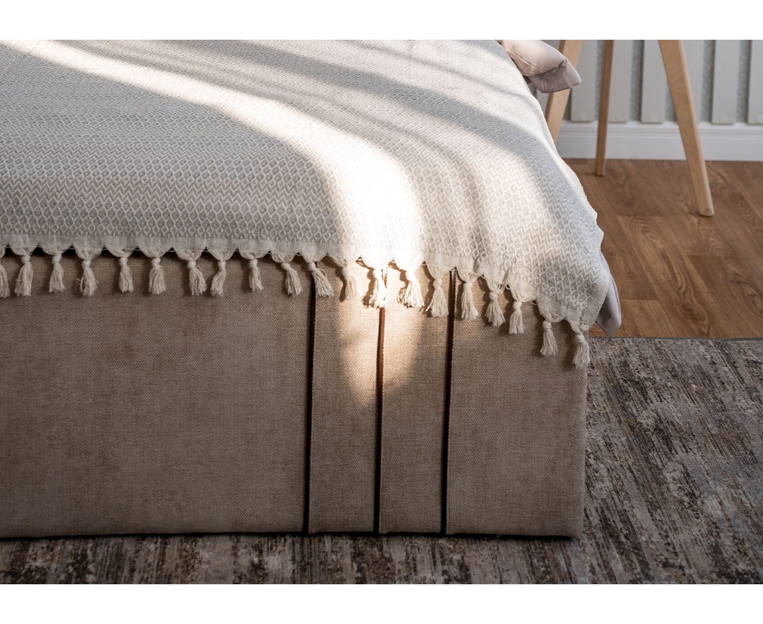 Кровать доступна в трех модных цветах и выполнена из высококачественной рогожки с антивандальными свойствами, что обеспечивает долговечность и надежность. Внутренняя обивка из спандбонда делает мебель устойчива к износу и механическим повреждениям, не впитывает влагу, гарантируя долгий срок службы.