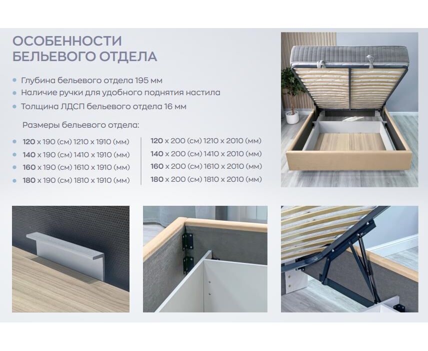 Кровать с парящим эффектом, имеет цельное ортопедическое основание с подъемным механизмом и бельевым настилом ЛХДФ