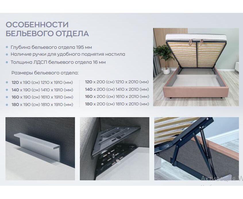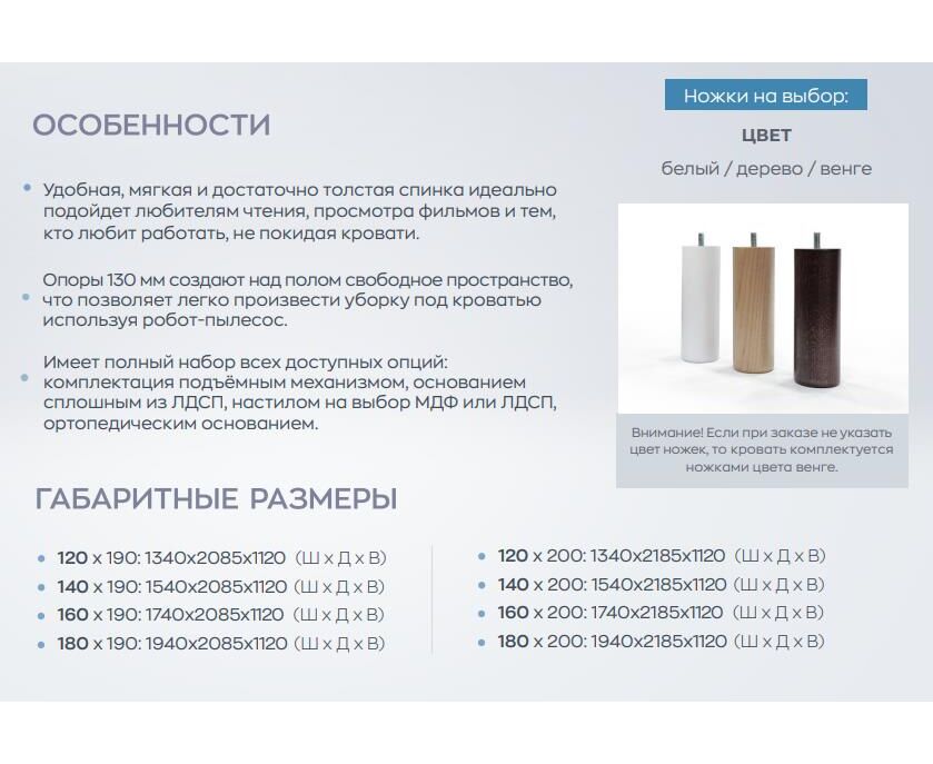 Кровать на ножках, имеет цельное ортопедическое основание с подъемным механизмом и бельевым настилом ЛДСП (на выбор: малый или большой)