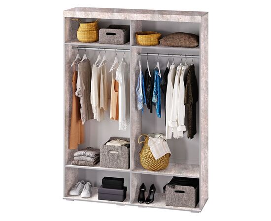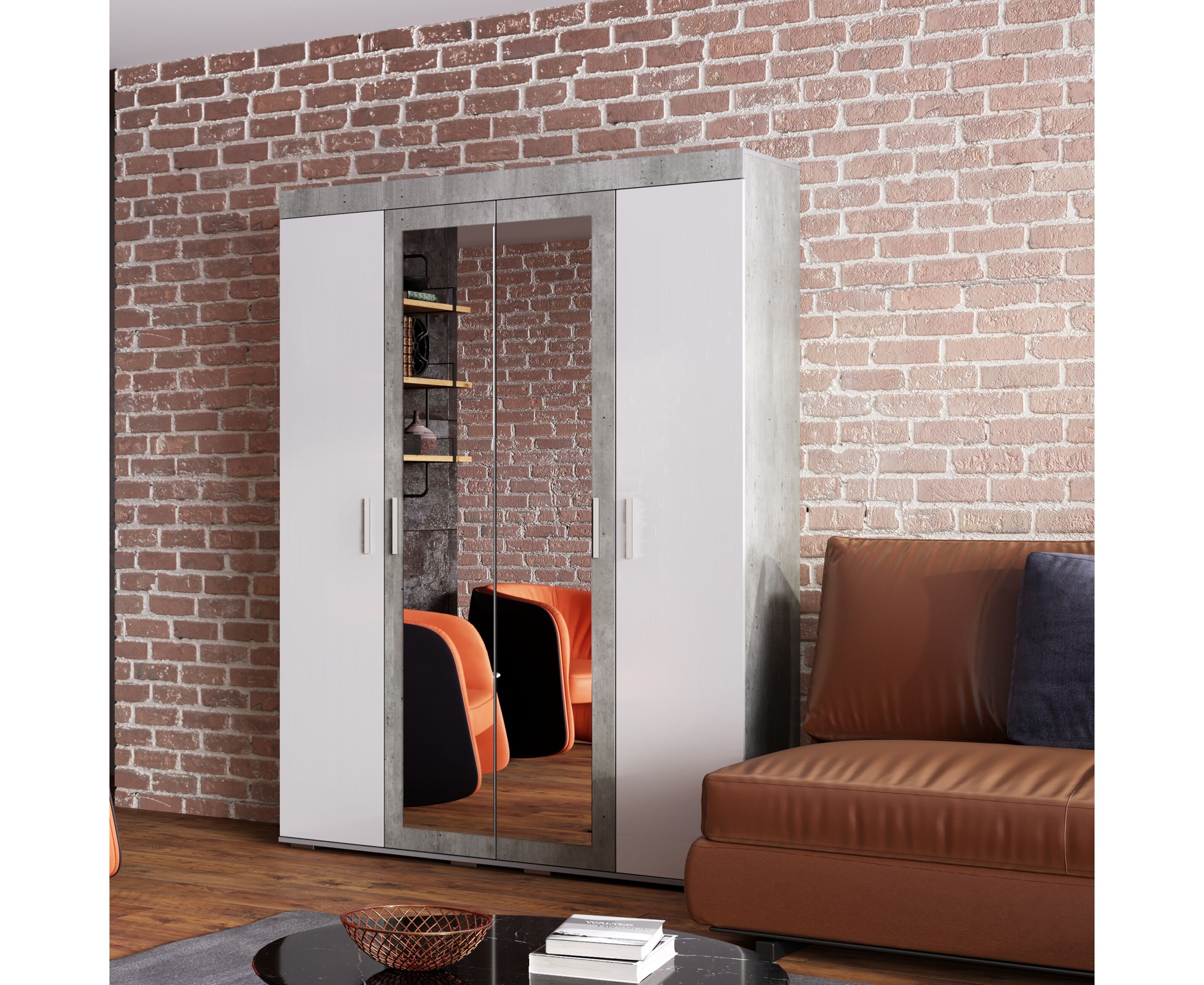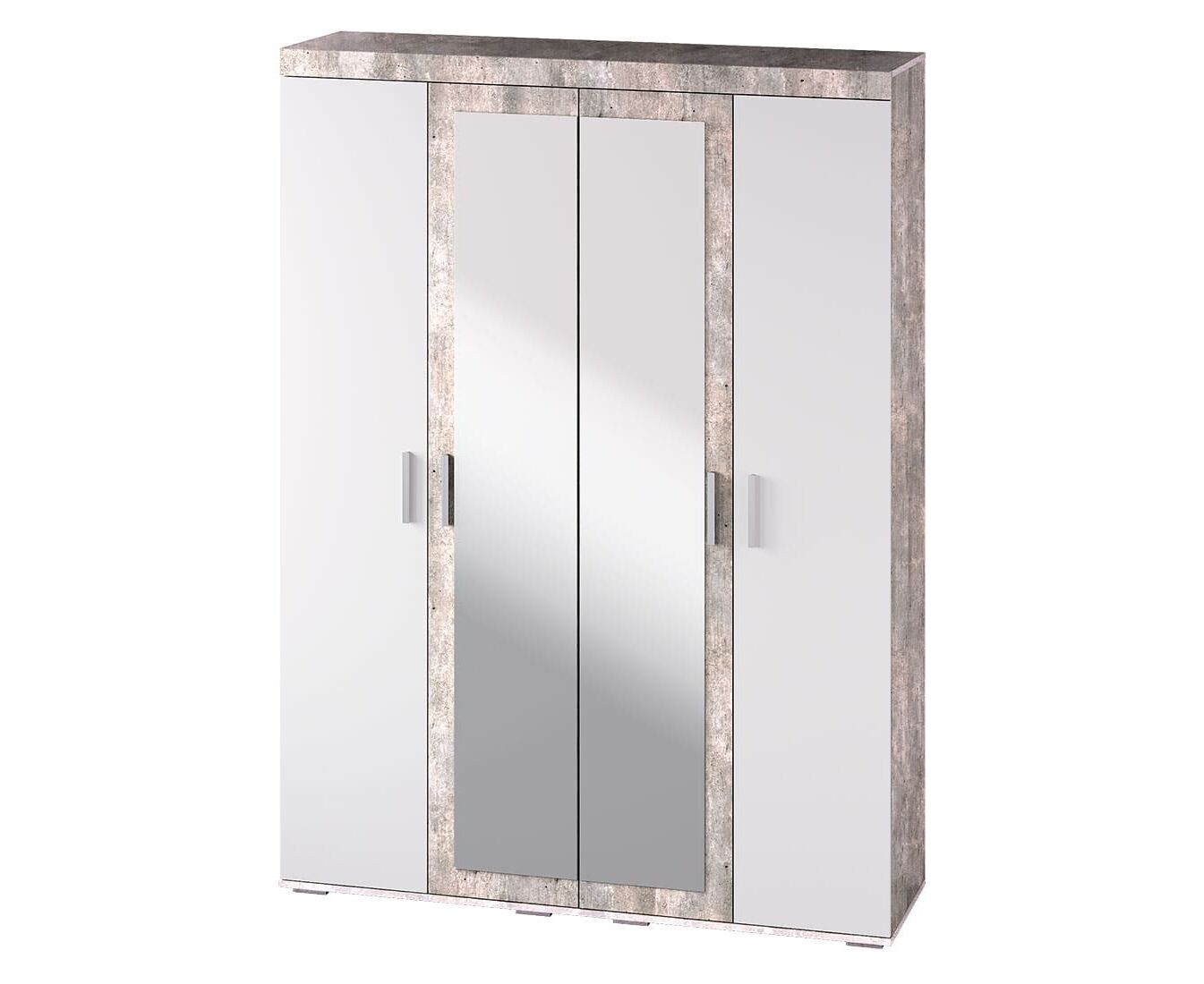 Современный четырёхстворчатый шкаф "Инстайл" выполнен в стиле одноименной модульной коллекции мебели. Модель состоит из четырех дверок, две из которых – зеркальные. Изделие выполнено в комбинации белого и цвета "бетон". Шкаф состоит из двух отделений со штангами, а также верхних и нижних полок для вещей. По желанию Вы можете заменить штанги полками ПЛ-08, которые приобретаются отдельно.