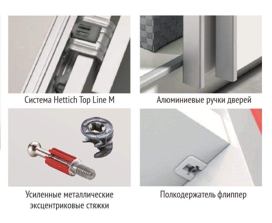 Плавный ход дверей обеспечивает надежная система Hettich Top Line M. Дополнительно можно установить доводчики. Снаружи нет заглушек и винтов благодаря стяжечной системе крепления полок на флипперах, а корпус усилен эксцентриковыми стяжками.