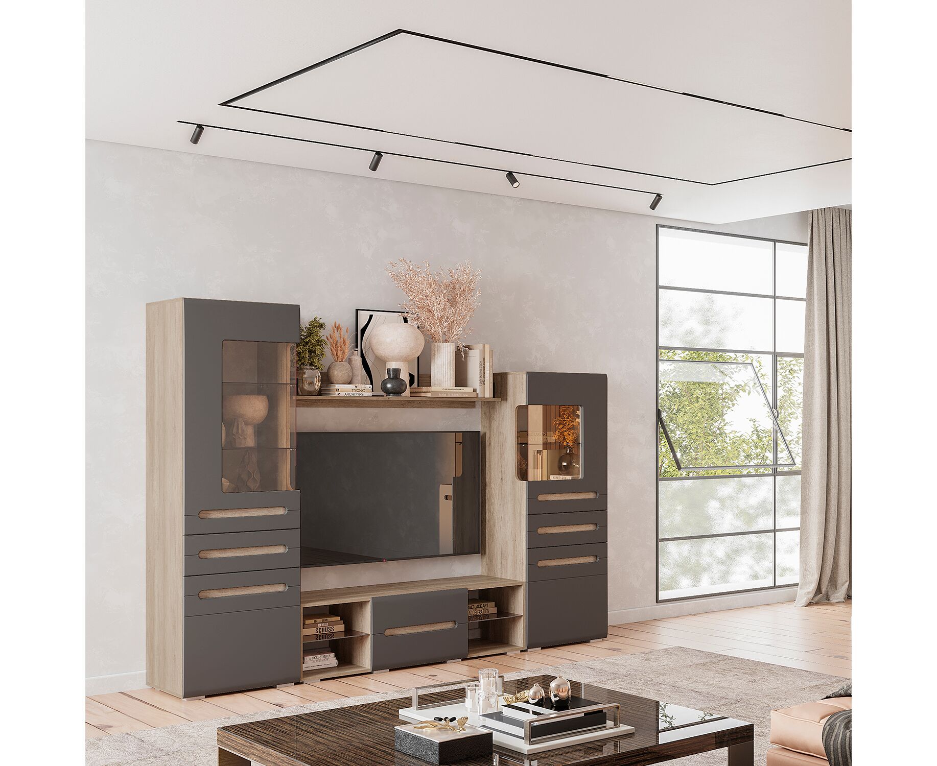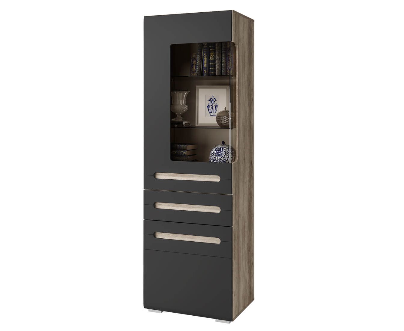 Модульная коллекция «Наоми» – это стильное современное решение в контрастном сочетании корпуса «дуб каньон» с элегантным матовым фасадом насыщенного грифельного оттенка. Оригинальное конструктивное решение коллекции – ручки фасадов, выполненные путем сложной фрезеровки с максимально реалистичным декором дубового спила.