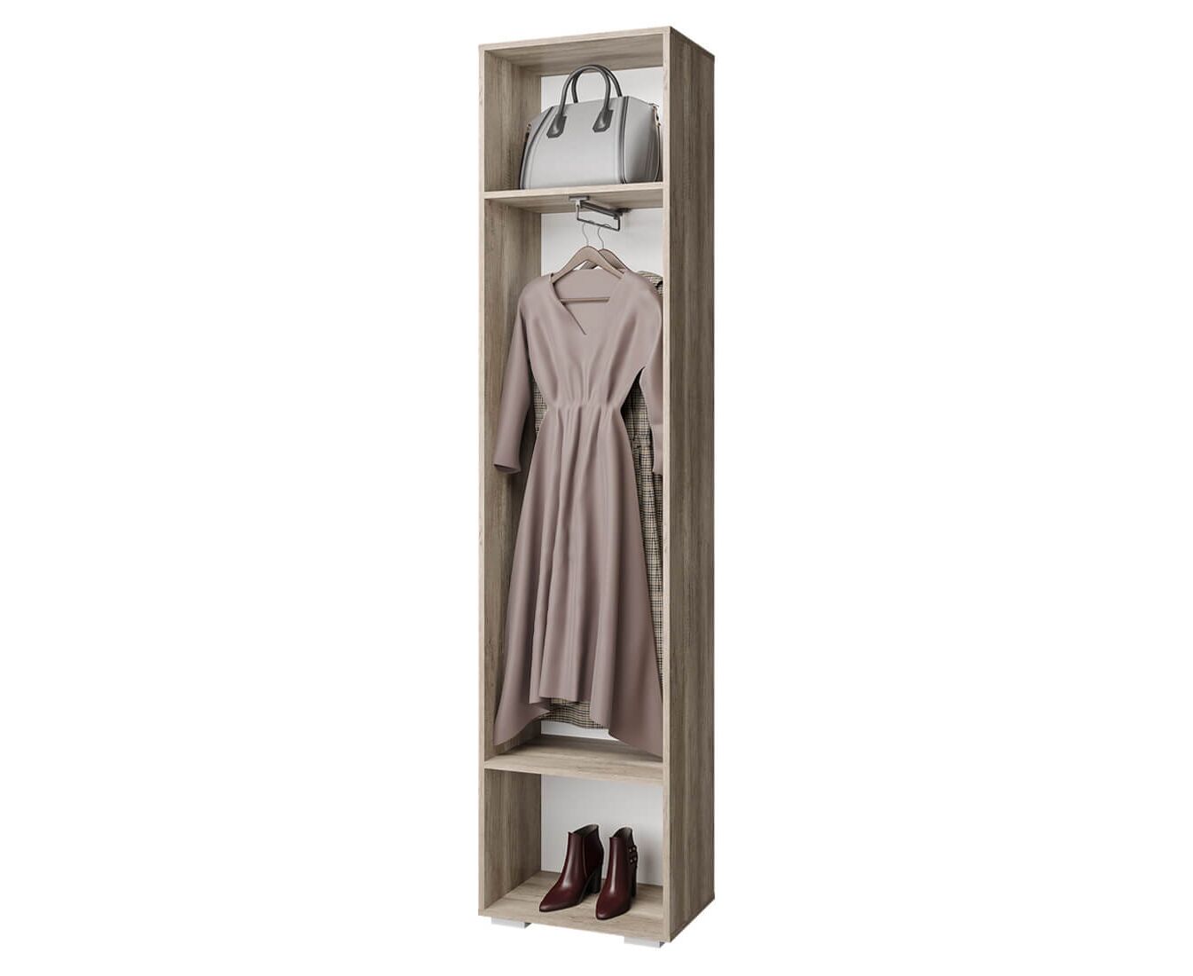 Стильный одностворчатый шкаф "Наоми" - прекрасное дополнение современного интерьера. Распашная дверка выполнена из МДФ темного серого цвета, ручка интегрирована в фасад. Данная модель состоит из выдвижной хромированной штанги для одежды на плечиках и двух вместительных полок.