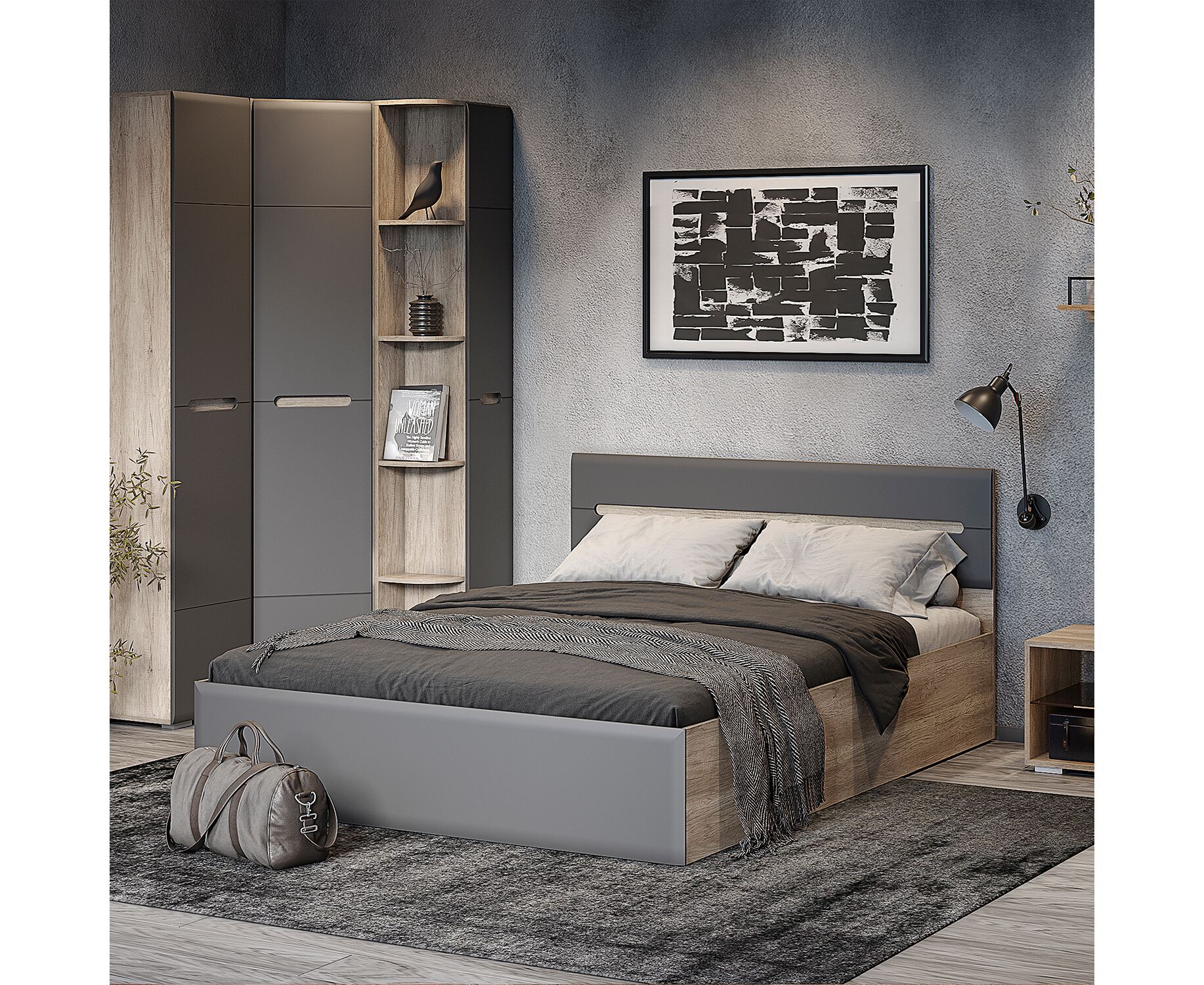 Модульная коллекция «Наоми» – это стильное современное решение в контрастном сочетании корпуса «дуб каньон» с элегантным матовым фасадом насыщенного грифельного оттенка. Оригинальное конструктивное решение коллекции – ручки фасадов, выполненные путем сложной фрезеровки с максимально реалистичным декором дубового спила.