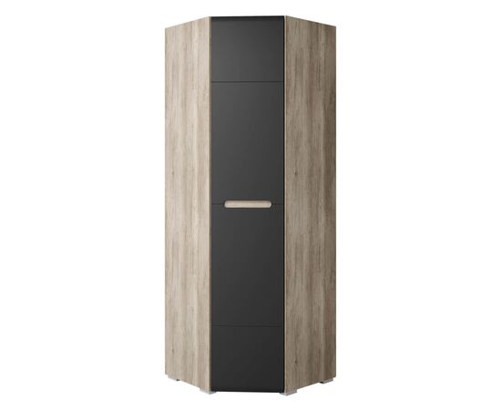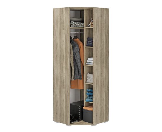 С умом использовать пространство поможет угловая модель шкафа "Наоми" из одноименной модульной серии. Изделие выполнено из ЛДСП, фасад распашной дверцы состоит из МДФ темного цвета и имеет встроенную ручку. Внутри шкаф разделен на две зоны для размещения одежды на вешалках и хранения сложенных вещей на полках.
