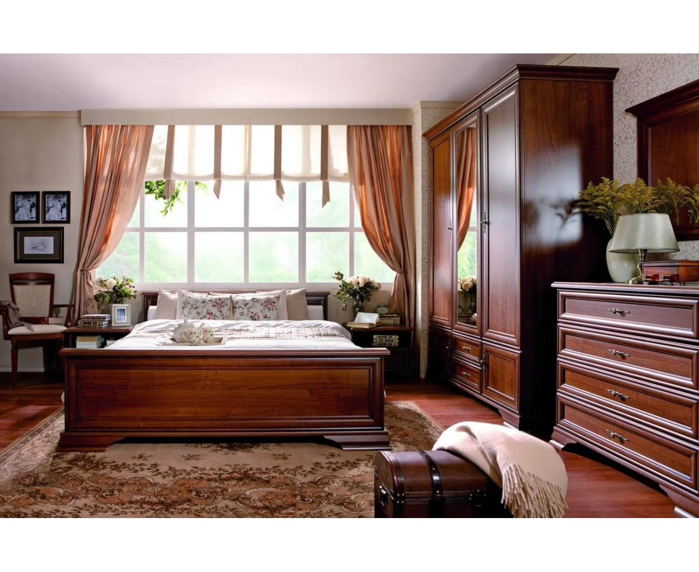 Спалный гарнитур Кентаки в цвете каштан изготовлен из ламинированной плиты ДСП и сверху покрыт декоративной пленкой МДФ.
