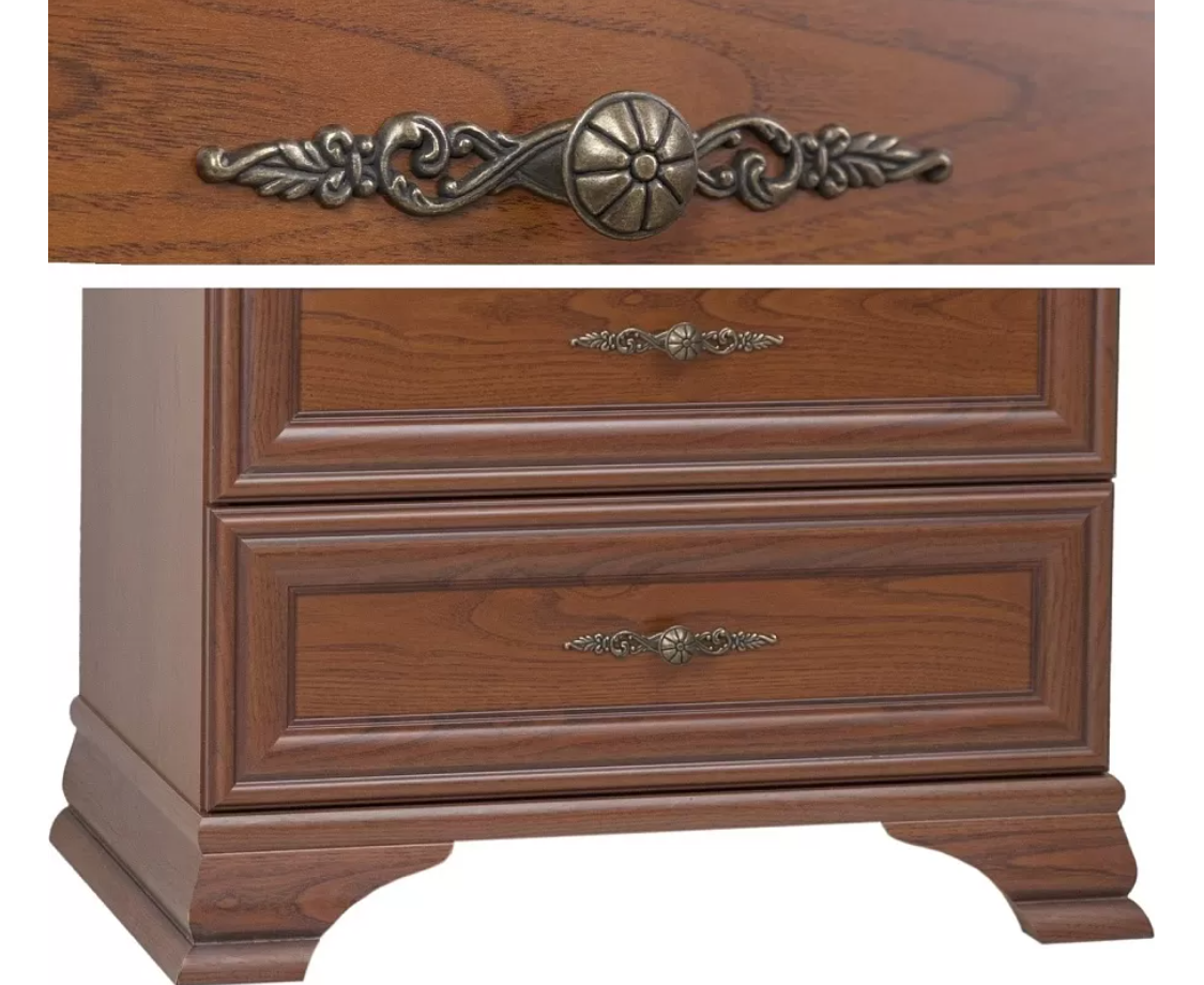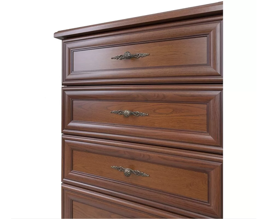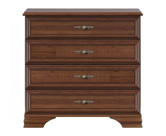 Комод коллекции Кентаки имеет широкие, устойчивые резные ножки и 4 ящика одинакового размера. В качестве декора и функционального элемента использована элегантная металлическая фурнитура. За счет высоты 90 см, ширины 94,5 см, глубины 44,5 см он вместит большой объем вещей и не загромоздит пространство.